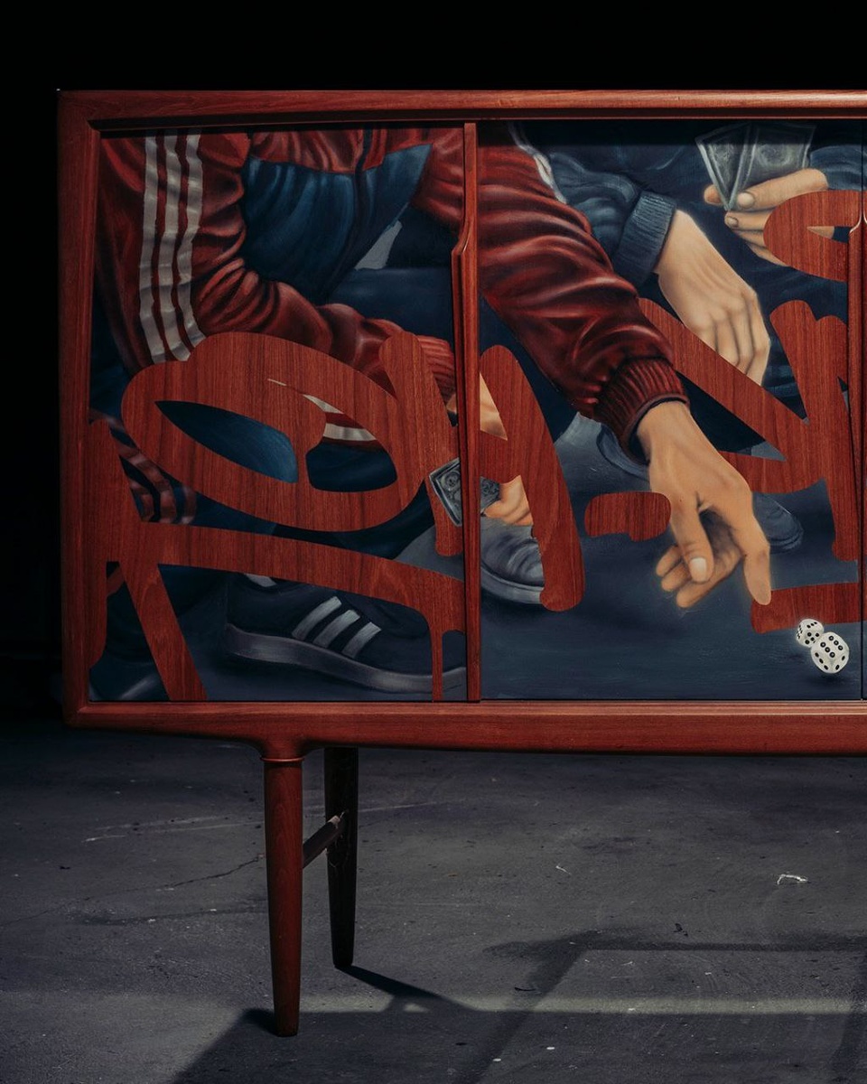 OH PARDON Franse 🟰🟰🟰 Роспись тумбы от уличного СДВГшника (он сам себя так называет) Двое встречают подростков из парижского квартала Игральные кости падают на влажную летнюю брусчатку В тот день мы теряем много денег и путешествуем автостопом по Европе. В наших рюкзаках столько же баллончиков с краской, сколько и одежды. Воспоминания, выполненные акрилом на тиковом дереве. 🍀 МЕРЧ ХУДОЖНИКА