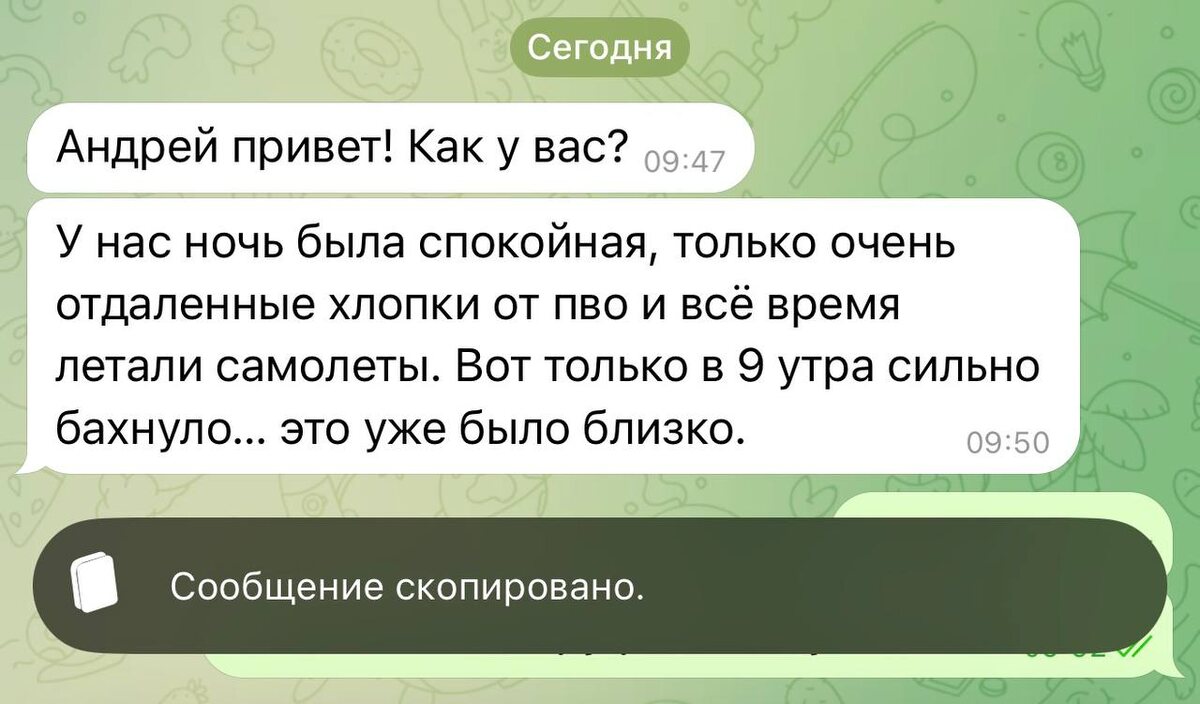 🤗 Как ночь прошла? Как дети? Все ли хорошо🙏 Благодаря Ирану я понял сколько у меня реально настоящих друзей, которые пишут и беспокоятся о нас ( семья)❤️ Мне утром написал Андрей, мой клиент. Он живет на Пальме и он видел все что происходило в первые дни в Дубае. Сейчас он намного спокоен и держит меня в курсе прям с первой береговой линии🙋♂️