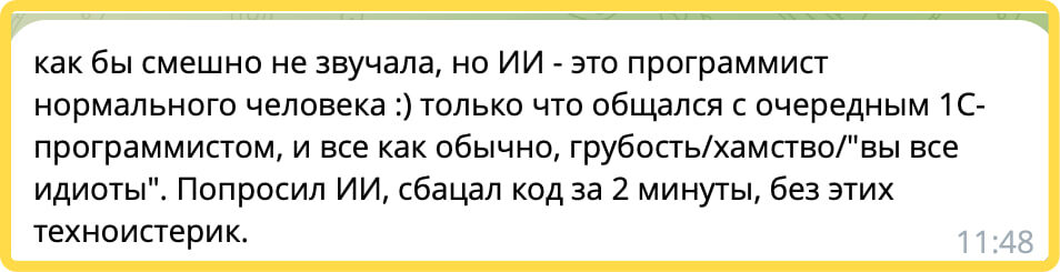 Делюсь - кстати, с такой точки зрения не изучал вопрос :) Но если вдуматься, то да - ИИ не устает, не жалуется, не просит зарплату, не выгорает, не ... Шучу конечно, но лишь с небольшой долей шутки. Русский ИТ бизнес +✅Мы в MAX