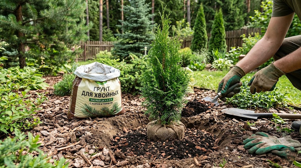 Многие садоводы из лучших побуждений сыплют в посадочную яму для хвойных перегной или золу. Но для них такой «курорт» губителен! Корневая система хвойных устроена иначе и требует совершенно других условий. В чем секрет идеального грунта? 🔽 🔸 Кислотность (pH 4.5–5.5) В нейтральной и тем более щелочной среде хвойные просто не усваивают питание — они начинают желтеть и чахнуть. Зола и мел под строгим запретом! Основу правильного грунта всегда должен составлять кислый верховой торф (рыжего цвета). 🔸 Воздушность и дренаж Корни хвойных задыхаются в тяжелой глине и моментально гниют при застое воды. Земля должна быть рыхлой, как губка. Смело добавляйте крупнозернистый песок. 🔸 Скромный рацион Забудьте про навоз и птичий помет! Избыток азота вызывает бурный, но слабый рост побегов, которые не успеют одревеснеть и просто вымерзнут зимой. 🔸 Секретный ингредиент — Микориза Хвойные в природе живут в симбиозе с полезными грибами на корнях. Чтобы запустить этот процесс, в грунт нужно добавить х