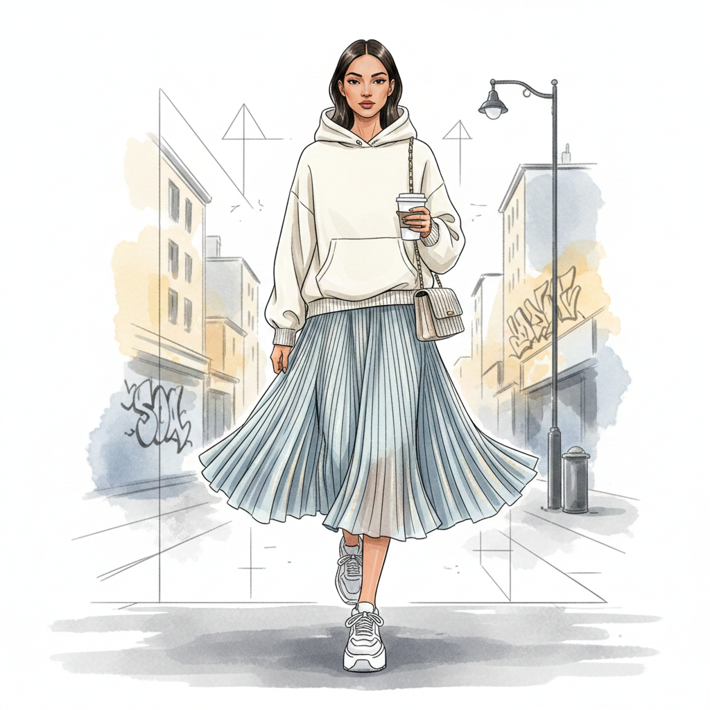 - Как носить: Наденьте плиссированную юбку с объемным худи, грубым свитшотом или мужским свитером крупной вязки. Контраст между деликатными складками и грубой фактурой верха — это база современного городского стиля.