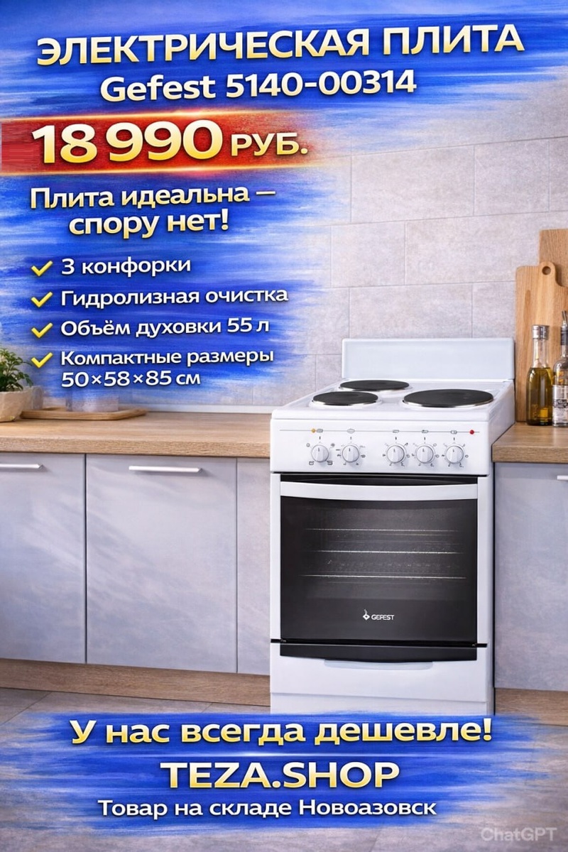 ! 🍴 Ищете простую, надёжную и удобную электрическую плиту? Обратите внимание на стильную 🇧🇾Gefest 5140-0031 в классическом белом цвете — практичное решение для ежедневной готовки 👌 Преимущества модели: ✅3 конфорки — всё необходимое для комфортной готовки ✅ Гидролизная очистка — лёгкий уход без лишних усилий ✅ Внутреннее покрытие SMART CERAMIC — просто чистить ✅ Термостат для точного контроля температуры духовки ✅ Объём духового шкафа — 55 литров ✅ Компактные размеры — 50 × 58,5 × 85 см 📣 У нас всегда дешевле! 🗺 TEZA.SHOP 🛒 В наличии на складе (Новоазовск) 📞 +7 (949) 301-08-41