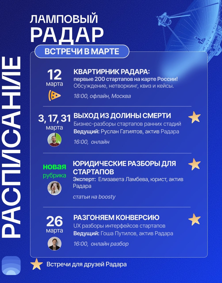 В марте Радар: отмечает появление карты стартапов России, проводит первую в этом году офлайн-встречу, запускает новую юридическую рубрику и активно готовится к РВФ 2026. 🆕 Новая рубрика Юридические разборы для стартапов от Елизаветы Ламбевой — основательницы юридического проекта LAMP На Boosty уже доступны статьи: - Как стать IT-компанией юридически, а не на словах: топ-3 ошибки начинающих стартаперов - Правда ли, что с 1 марта 2026 года станет рискованно использовать название на английском языке? 🍕«Квартирник Радара: первые 200 стартапов на карте России!» 🔴12 марта, 18:00, офлайн, Москва Обсуждение, нетворкинг, квиз и кейсы, поедание пиццы, совместные фото Лофт «Гостиная для Друзей»! Здесь наша любимая ламповая атмосфера! Подробнее ➡️что будет и как принять участие 〰️〰️〰️ 🖥 Онлайн-встречи для Друзей Радара Получить доступ к закрытому сообществу и эфирам можно по ссылке: ⭐️productradar.ru/friends⭐️ 🔴«Выход из долины смерти» Разборы стартапов ранних стадий 16:00 - 18:00 (МС