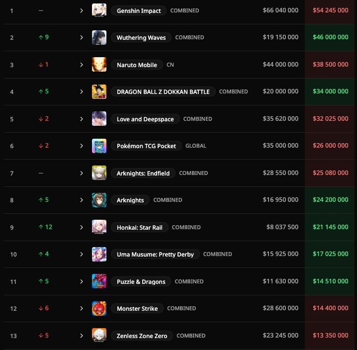 1⃣ Геншин, несмотря на падение дохода за месяц до 54,2 млн $, остался на 1 месте 2⃣ HSR же прибавил 12 строчек с выходом 4.0 и заработал 21 млн $. Дальше больше 💪 3⃣ ZZZ вылетела из десятки в которой держалась два месяца, опустившись на 13 и заработав 13,3 млн $. К сожалению, ангелочки не спасли 💬 Как думаете, какие результаты будут в марте? ㊗️ Поддержи Сенсея бустом / Подпишись на Сенсея