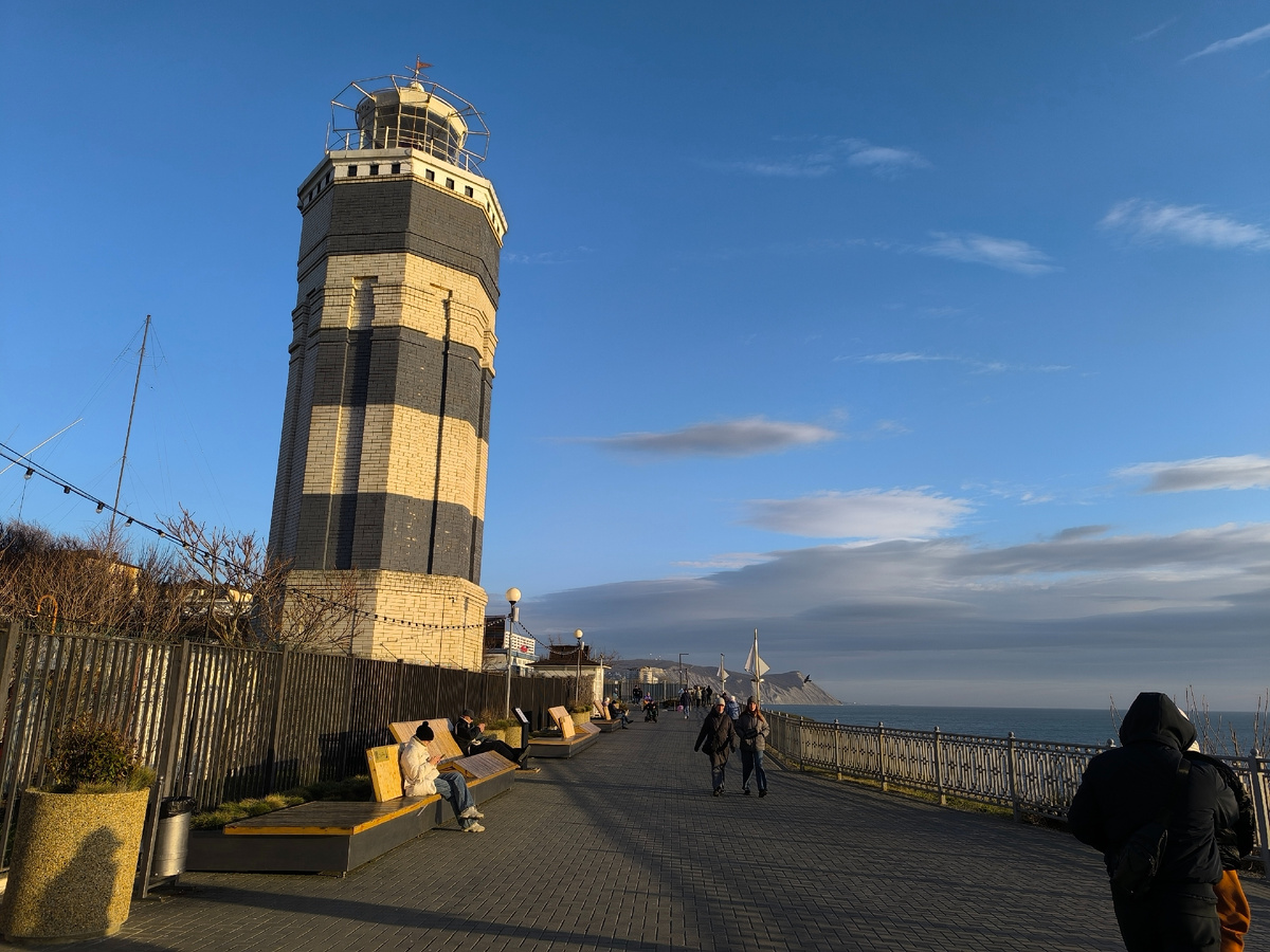 Но сначала про вчерашний вечер. Анапский маяк на месте. Люблю тут на солнышке поваляться на лежбище (и не я одна). В солнечный денёк свободные места отсутствуют. Дамы всех возрастов, включая дошкольный, стараются укладываться плотнее, чтобы выкроить краешек лежбища какой-нибудь стройняшке. Лежать там на солнышке, скажу вам -- это класс. Тёплое, нагретое солнцем, дерево с одной стороны, припекающее зимне-весеннее солнышко с другой. Витамин D опять же, плюс эндорфины, плюс общение. В Анапу на отдых приезжают люди позитивные, дружелюбные, активные и весёлые. Это я давно приметила. Так что лежбища у Анапского маяка -- место релакса и оздоровления. На фото получился Пизанский Маяк. На самом деле он без наклона конечно. Это фотокамера так чудит.