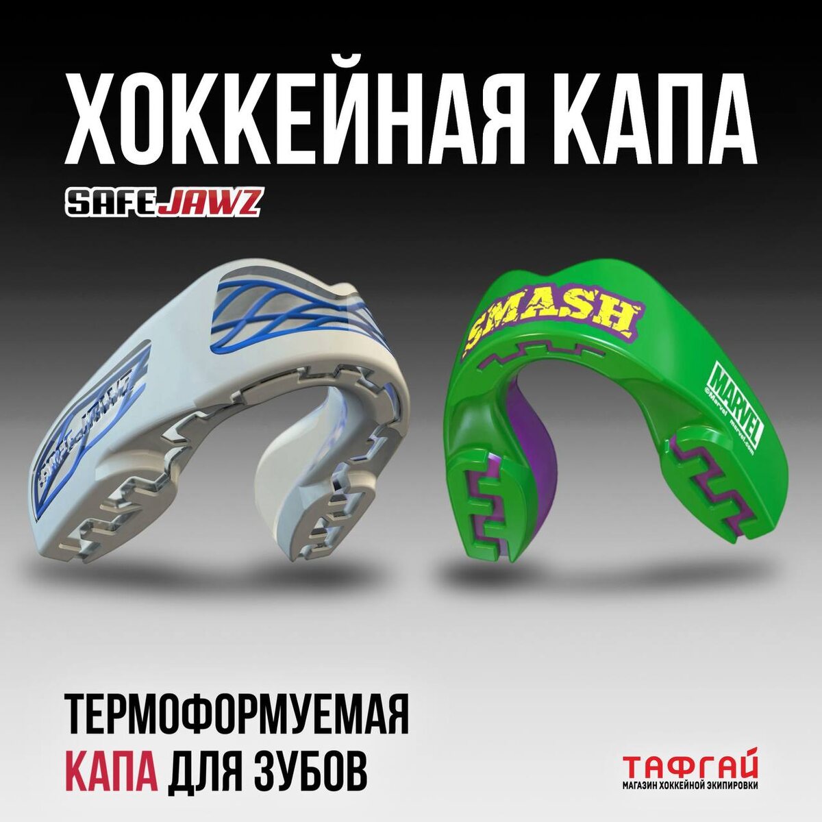 В «Тафгай» поступили новые капы SAFEJAWZ - бренд, который доверяют в самых контактных видах спорта. ПОЧЕМУ SAFEJAWZ - ЭТО ОСОЗНАННЫЙ ВЫБОР? ✅ Технологии FLUID FIT + REMODEL TECH: Капа быстро формуется в кипятке точно по челюсти. Не с первого раза? Нормально. Формовку можно повторять несколько раз, пока не сядет как нужно. ✅ Конструкция SHOCKCAGE: Трёхслойная система для максимального поглощения удара. Премиум-защита. ✅ Продуманная деталь: Каждая капа идёт с боксом для хранения. Защита должна быть чистой. ВЫБИРАЙ СВОЙ УРОВЕНЬ ЗАЩИТЫ И СТИЛЯ: ❄️EXTRO ICE EDITION - лимитированная хоккейная версия. 👍INTRO SERIES - базовая, надёжная, без компромиссов. 💪MARVEL SERIES - с крутым дизайном супергероев. 🛡NITRO SERIES - топовая защита с технологией SHOCKCAGE. Зубы - не расходник. А капа - не формальность. Это - твой последний рубеж защиты, когда игра переходит в жёсткий контакт. Тафгай. Играешь жёстко - защищайся на уровне🏒💪 #тафгай_выбор_сильных