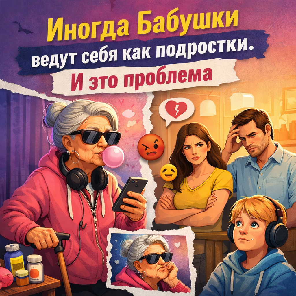 Мы много говорим о «трудных подростках», но почти не обсуждаем другую сторону семейной жизни: иногда пожилые женщины ведут себя так, словно им снова пятнадцать. Обиды, ультиматумы, эмоциональные качели — и вся семья живет в напряжении. Это неудобная тема, но замалчивание не решает проблему. Честный взгляд помогает понять, что происходит и как сохранить отношения. Как выглядит «подростковое» поведение у бабушек Речь не о живости характера или желании быть современной. Речь о повторяющихся регрессивных реакциях: * частые обиды и драматизация бытовых ситуаций; * демонстративное молчание и ультиматумы; * давление через здоровье или одиночество; * ревность к супругам детей; * требование постоянного внимания и отчетов. Для подростка такие реакции — этап взросления. Для пожилого человека — сценарий, разрушающий семейные границы. Почему это происходит Потеря социальной роли После выхода на пенсию уменьшается социальный статус и значимость. Дети становятся главным источником внимания, и начинае