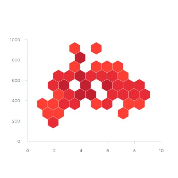 t.me/benchmarka Шестиугольная сегментация — еще один способ решить проблему наложения большого количества точек друг на друга. При шестиугольной сегментации отображается плотность, а не сами точки. Точки распределяются по шестиугольным ячейкам, а распределение (количество точек в ячейке) отображается с помощью цвета или площади шестиугольников. Существует множество причин, по которым для разбиения двумерной поверхности на плоскости на бины используются шестиугольники, а не квадраты. Самая очевидная из них заключается в том, что шестиугольники больше похожи на окружность, чем на квадрат. Это обеспечивает более эффективное агрегирование данных вокруг центра бина. В этом можно убедиться, изучив некоторые особенности шестиугольников и, в частности, гексагональной тесселяции. ФУНКЦИЯ: Корреляция, Распределение