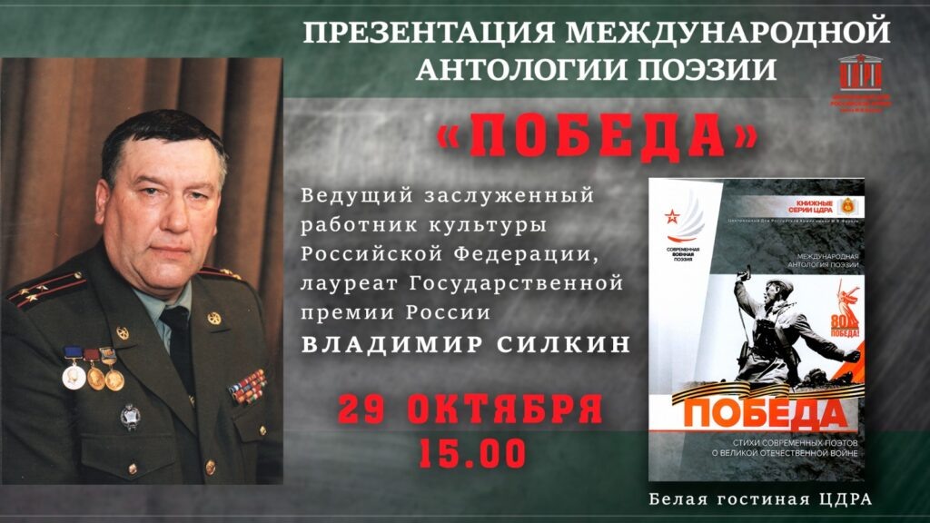 9 октября в ЦДРА Минобороны России состоялась презентация Международной Антологии поэзии «ПОБЕДА», сборника произведений по тематике Великая отечественная война, изданного Центральным Домом Российской армии им. М.В.Фрунзе. Редактором составителем книги является академик ИАСК Владимир Александрович Силкин – начальник военно-художественной студии писателей, лауреат Государственной премии. Презентация книги, проведённая под руководством Владимира Александровича Силкина, обратилась в творческую встречу людей-единомышленников. Живой интерес к мероприятию проявила и молодёжь. Студентка 2-го курса Гуманитарного университета Анна Ионова написала с чате своего института: «Встреча была довольно продолжительна, но атмосфера не могла оставить равнодушными. Гордость, благодарность, память… Все слилось воедино! Мероприятие стало реальным местом объединения людей с одинаковыми взглядами на прошлое, память, гордость за своих героев, и, разумеется, на поэзию». Отрадно то, что в число авторов презентова