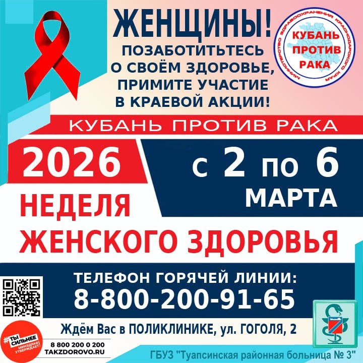 ⚠️ Основной причиной онкологических заболеваний являются перемены, происходящие в клетках организма: изменение генетического кода на постоянное, неконтролируемое деление. Для своевременного выявления онкологических заболеваний проводится акция "Кубань против рака". ♀️ Женщин врачи приглашают с 2 по 6 марта на "Неделю женского здоровья". ⏱️ Осмотр в среднем длится 15 минут. Осматривается кожа, щитовидная железа, состояние наружных слизистых оболочек (полости рта, влагалища, анальная область), лимфоузлы, молочные железы, берется мазок на атипичные клетки с шейки матки. ☝️ При подозрении на наличие опухоли, пациента направят к специалистам-онкологам. ‼️ Среди причин запущенности онкозаболеваний на первом месте – поздняя обращаемость за медпомощью, на втором – скрытое течение заболевания. Коварство рака заключается в том, что он никак себя не проявляет на ранних стадиях. 👉 Подробнее на нашем сайте: https://hosp23.ru/medevents/742-kubanagainstcancerwoman.html