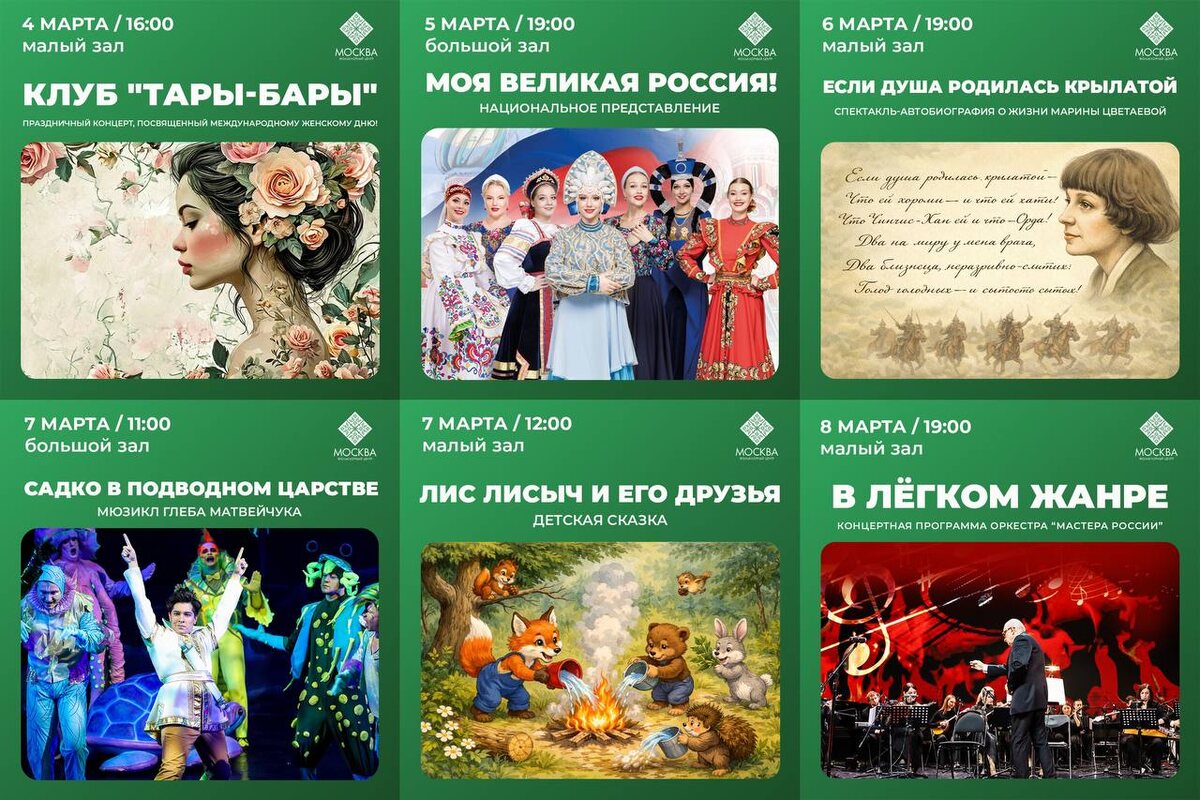 Приглашаем провести эту неделю вместе с нами в Фольклорном центре «Москва»! 🌷4 марта / 16:00 / Малый зал «Клуб “Тары-Бары”» - праздничный концерт к Международному женскому дню, наполненный светом и теплом. 🎭5 марта / 19:00 / Большой зал «Моя великая Россия!» - масштабное национальное представление, где оживают традиции и раскрывается красота нашей Родины. 🖌️6 марта / 19:00 / Малый зал «Если душа родилась крылатой» - проникновенный спектакль о жизни Марины Цветаевой, о силе таланта, свободе духа и непростой судьбе поэта. 🐠7 марта / 11:00 / Большой зал «Садко в подводном царстве» - яркий мюзикл Глеба Матвейчука с волшебной атмосферой, морскими тайнами и захватывающими приключениями. 🐞7 марта / 12:00 / Малый зал «Лис Лисыч и его друзья» - добрая детская сказка о дружбе и маленьких чудесах, которые случаются, когда по-настоящему любишь природу. 🎻8 марта / 19:00 / Малый зал «В лёгком жанре» - праздничная концертная программа оркестра «Мастера России», где музыка звучит легко, изящно и