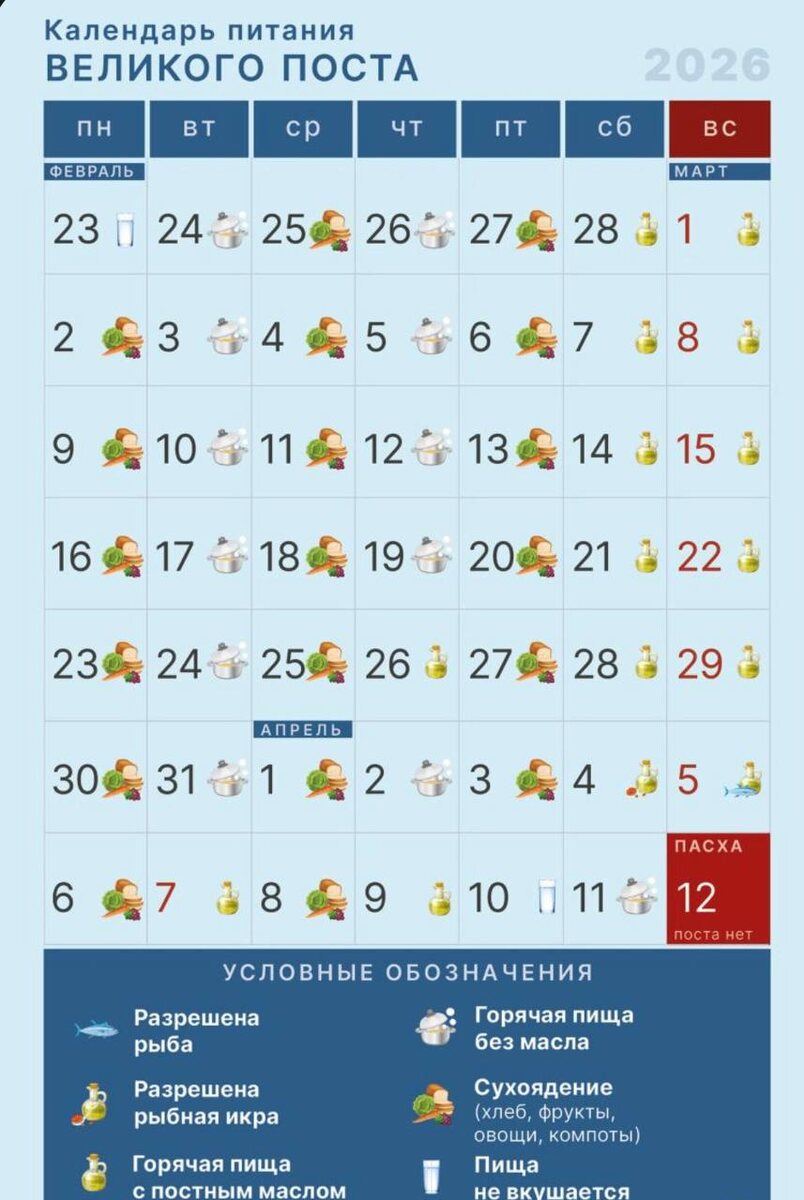 🕊 Великий пост — время духовного и физического воздержания Великий пост — самый главный, продолжительный и строгий из всех православных постов. Он установлен в подражание сорокадневному посту Христа в пустыне. Наиболее строгими считаются первая и последняя (Страстная) недели. 📜 Пост для мирян Миряне, как правило, постятся мягче, согласуя это со своим духовником и в зависимости от своих жизненных обстоятельств: 🔘Обычно не практикуется сухоядение и отказ от растительного масла. 🔘Кто-то полностью воздерживается от рыбы, кто-то допускает её в отдельные дни. 🔘Иногда силы подкрепляют морепродуктами — кальмарами, креветками и т.п. Для беременных, кормящих, тяжело болящих и детей пост смягчается. Детям и будущим мамам достаточно отказаться от мяса (если нет особых указаний врача). Важно подумать, от чего из любимого можно отказаться — например, сладостей. 🙏 Пост — это не только воздержание от пищи, но и время молитвы, размышления и духовного очищения.