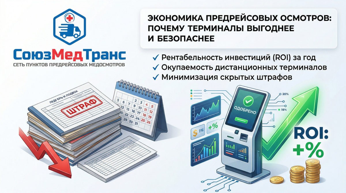 Программно-аппаратный комплекс (терминал) берет на себя замеры, а врач смотрит результат удаленно (один врач на 5–10 терминалов). Предположим, стоимость приобретения терминала (ПАК) с инсталляцией и настройкой = 250 000 рублей (среднерыночная цена). Ежемесячное обслуживание (софт, калибровка, удаленный медперсонал) — 5 000 руб./мес. Сравнивать будем с аутсорсингом в частную клинику по цене 100 руб./осмотр. Сценарий 1: Автопарк на 10 машин Сценарий 2: Автопарк на 50 машин (Сладкое место) Сценарий 3: Автопарк на 100+ машин Вывод: Для парков от 30 машин покупка терминала — это инвестиция с окупаемостью менее полугода. Дальше — чистая экономия бюджета. Многие директора говорят: «У меня тетя-медсестра за 20 тыс. ру