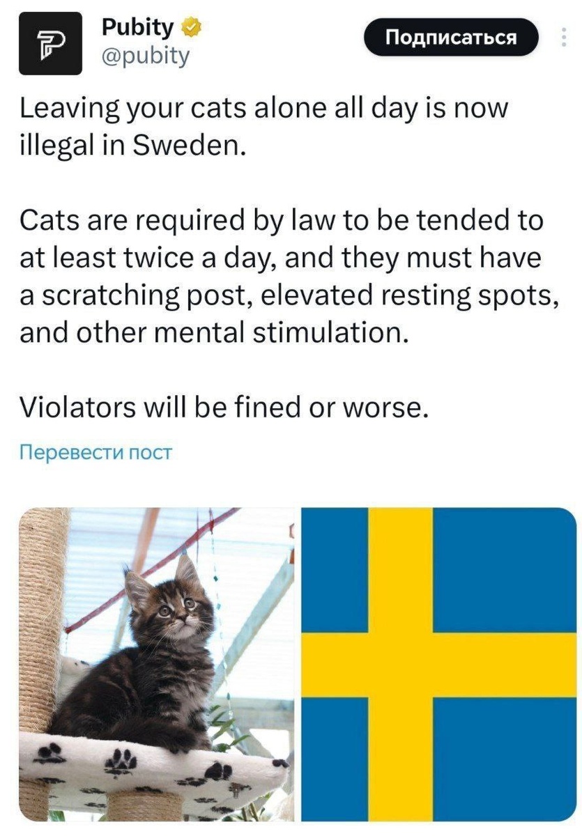 Местные власти ввели правила, которые превращают жизнь обычного кота в настоящий курорт. ⠀ Теперь оставлять пушистого в одиночестве на весь рабочий день — это не просто грустно, а противозаконно. Хозяин обязан проверять питомца минимум дважды в сутки. Но это не всё: «кожаный» обязан играть с котом, чесать его, обеспечить когтеточкой и даже обустроить несколько разных мест для отдыха и созерцания мира. ⠀ Всё это делается ради психологического здоровья животных. В Швеции считают, что кошки тоже склонны к депрессии, а доводить до такого — преступление. Нарушителям светят не только внушительные штрафы, но и реальный тюремный срок в самых запущенных случаях. ⠀ Кажется, шведские коты живут лучше, чем многие из нас в понедельник утром.