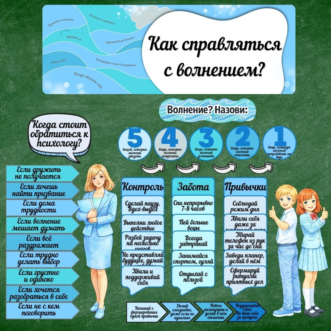 😶🌫️Волнение перед важным событием - знакомое состояние и для детей, и для взрослых. Экзамены, выступления, контрольные, новые коллективы, серьёзные решения - всё это вызывает тревогу. В школе тема волнения становится особенно актуальной в период подготовки к ОГЭ и ЕГЭ, а также в моменты повышенной учебной нагрузки. Именно поэтому разговор о том, как управлять своими эмоциями, сегодня входит в число важных профилактических задач.