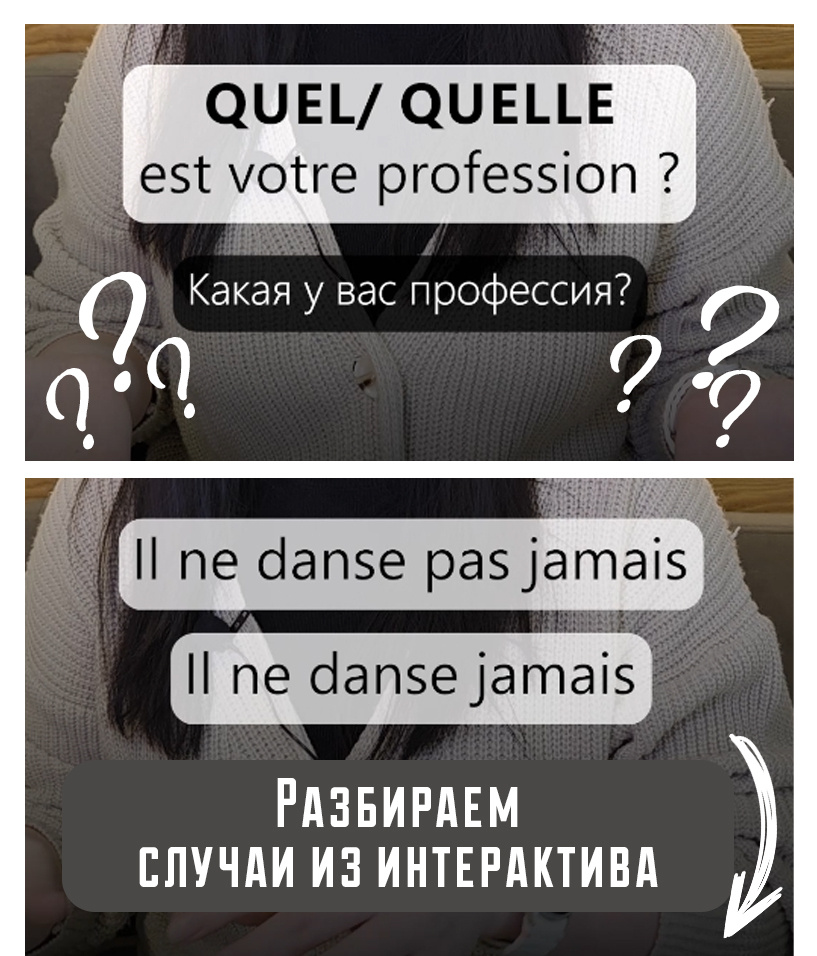 В этой статье разберем с вами две важны темы французского, которые были в нашей рубрике "Грамматический интерактив": Cлово quel изменяется в зависимости от рода и числа существительного, к которому относится: Примеры для сравнения: ✅ Quel est ton prénom ? (le prénom — муж.род) ✅ Quelle est ton adresse ? (l’adresse — жен.род) ✅ Quelle est votre profession ? (la profession — жен.род Запоминаем: • Quel(s) + мужской род → Quel âge? Quels livres? • Quelle(s) + женский род → Quelle heure? Quelles adresses? Во французском языке есть отрицательные наречия, которые сами по себе выражают отрицание и заменяют частицу pas. Основные отрицательные конструкции: Il ne danse pas — Он не танцует Il ne danse jamais — Он никогда не танцует Il ne dit rien — Он ничего не говорит Il ne voit personne — Он никого не видит Il ne danse plus — Он больше не танцует Il n'a aucune idée — У него нет никакой идеи (Он понятия не имеет) 💡 Запоминайте: «pas» НЕ используется одновременно с jamais, rien, personne и т.д.