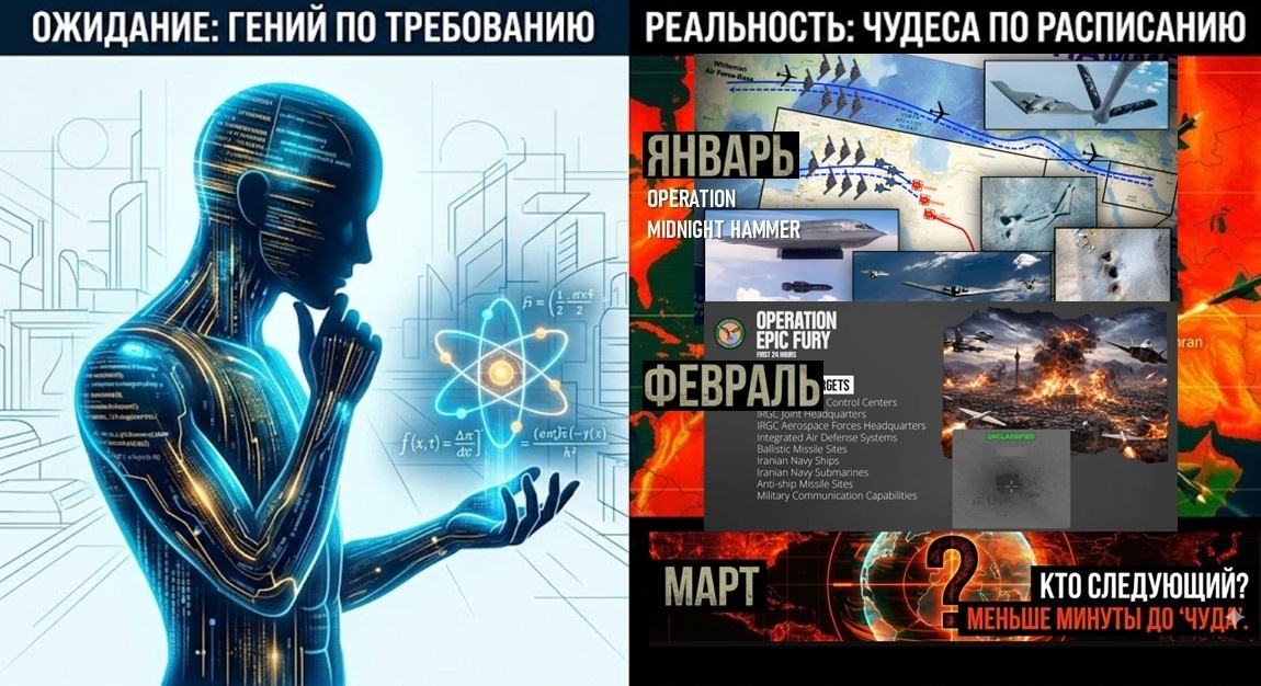 В сентябре 2025 я писал: GPT-7 будет «Гением по требованию». Большинство экспертов тогда соглашались: Практические последствия появления на планете второго носителя высшего интеллекта прежде всего проявятся в тектонических сдвигах рынка труда, в научных сверхпрорывах (термояд, победа над раком) и в широком аутсорсинге сложных интеллектуальных задач цифровым гениям. Всё получилось иначе. Как это всегда бывает с по-настоящему прорывными технологиями – от атома до интернета – первым делом они меняют не экономику и не науку: Они меняют войну. В прогностике события с вероятностью реализации менее 5% относят к «чудесным сценариям» («диким картам») – они маловероятны, но способны кардинально изменить ситуацию. «Чудо по расписанию» до сих пор было категорией из области фантастики. Теперь – нет. Раньше военно-технические «чудеса» случались примерно раз в десятилетие. Стелс. GPS-наведение. Беспилотники. Между ними – годы, а то и десятилетия накопления. «Чудо» было событием поколения, а не кварта