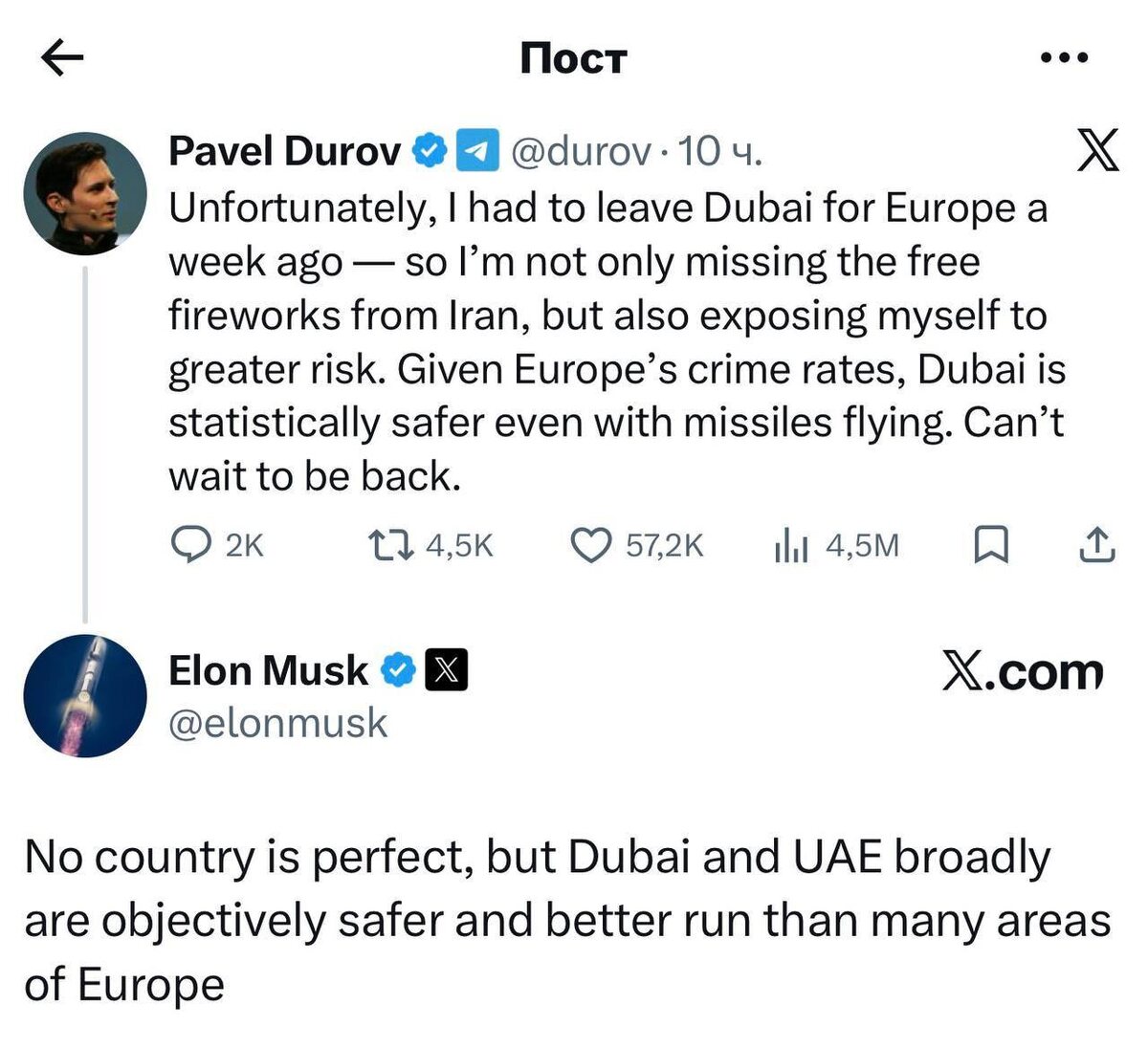 📱 Илон Маск подтвердил слова Павла Дурова, отметив, что Дубай и ОАЭ в целом объективно безопаснее и лучше управляются, чем многие регионы