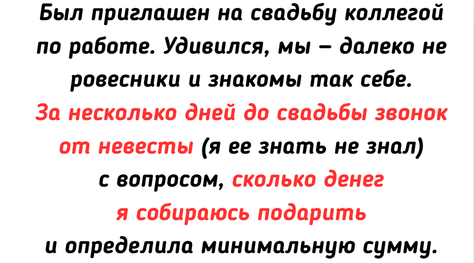- Был приглашен на свадьбу коллегой по работе. Удивился, мы — далеко не ровесники и знакомы так себе. За несколько дней до свадьбы звонок от невесты (я ее знать не знал) с вопросом, сколько денег я собираюсь подарить и определила минимальную сумму. Я был в шоке от такой беспардонности и отказался от приглашения, сославшись на занятость.