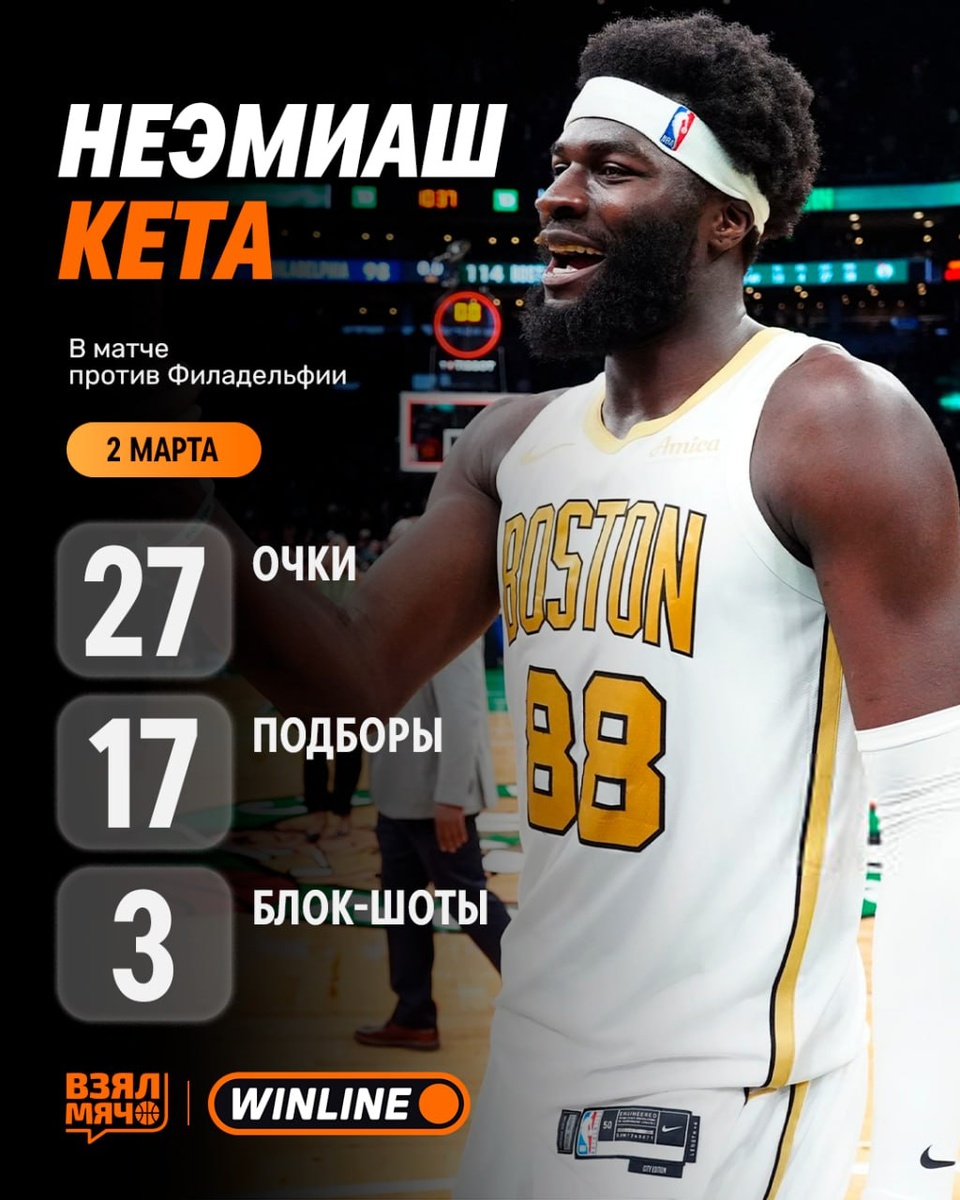 ! Неэмиаш Кета показал исторический перфоманс в матче с «Филадельфией». У него 27 очков, 71% с игры, 17 подборов (10 в атаке), 2 передачи, 3 блок-шота и 1 перехват за 27 минут. Он стал первым игроком «Селтикс» со времен Роберта Пэриша в 1989 году, набравшим 25+ очков и 10+ подборов на чужом щите за одну игру. 🏀 ПОДПИШИСЬ — ЗДЕСЬ ЖИВЁТ БАСКЕТБОЛ!