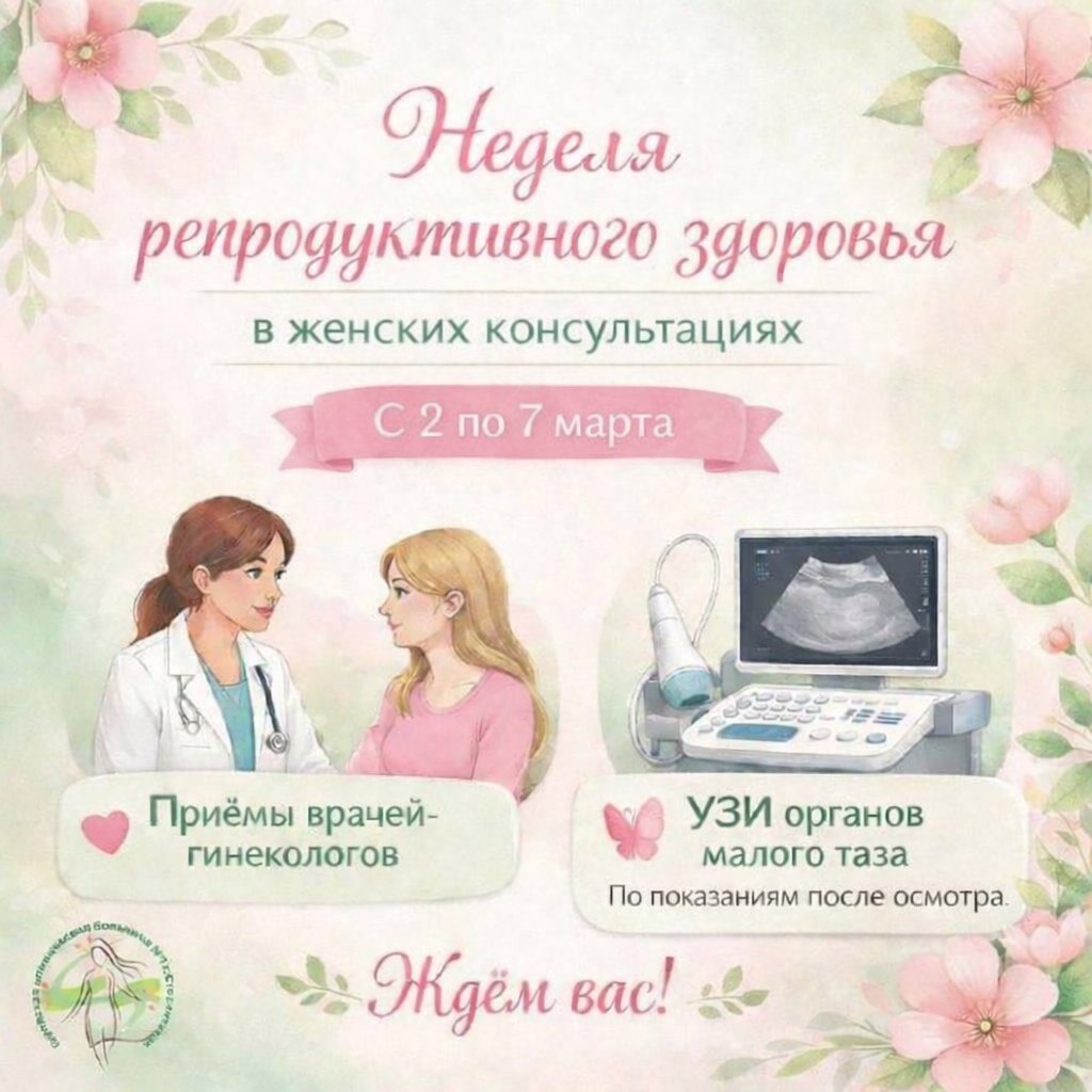 Каждая первая неделя месяца в ГКБ №1 - время для заботы о женском здоровье. Женские консультации будут принимать женщин от 18 до 49 лет с 2 по 7 марта без записи, согласно графику работы кабинетов. Что будет доступно? — Осмотр врачом-гинекологом. — По результатам осмотра врач назначит необходимые исследования, включая УЗИ органов малого таза (если это потребуется). Помните, что регулярные профилактические осмотры помогают выявить заболевания на ранних стадиях, предотвратить осложнения и сохранить ваше репродуктивное здоровье на долгие годы. Акция проводится в соответствии с целями национального «Продолжительная и активная жизнь». По информации ГКБ №1