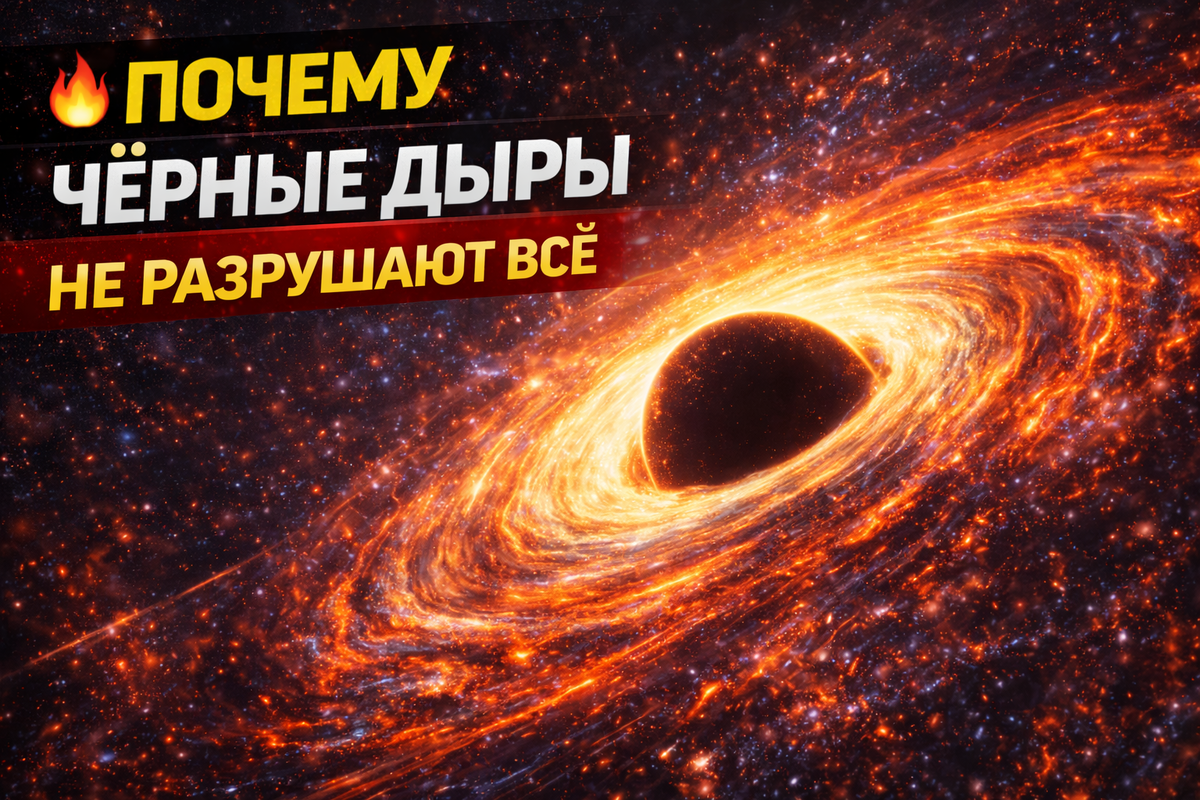 Когда слышишь слова "чёрная дыра", воображение рисует космический пылесос, который втягивает звёзды, планеты и целые галактики. Кажется, что если где-то рядом образуется такая штука - всё обречено. Но реальность гораздо спокойнее. Чёрные дыры существуют почти в каждой крупной галактике. И при этом Вселенная не превращается в хаос. Более того - без них она могла бы выглядеть совсем иначе. Так почему же они не уничтожают всё вокруг? Начнём с главного. Чёрная дыра - это объект с чрезвычайно сильной гравитацией, возникший после коллапса массивной звезды. Если масса звезды превышает примерно 20 солнечных, её ядро может сжаться до состояния, из которого даже свет не может вырваться. Но важно понимать: гравитация чёрной дыры на расстоянии ничем не отличается от гравитации обычной звезды той же массы. Если бы Солнце внезапно заменили чёрной дырой такой же массы, Земля продолжала бы вращаться по той же орбите. Она не была бы мгновенно "засосана". Просто стало бы темно. Опасность чёрной дыры сущ
