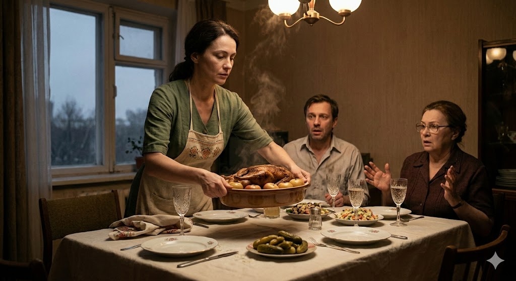 Анна молчала. Она взяла большое блюдо с главным угощением и понесла его на кухню. Вернулась. Забрала салатницу. Вернулась еще раз — унесла соленья и нарезку. Она ходила туда-сюда, методично, невозмутимо очищая стол. Красивая посуда, приборы, свежий хлеб — всё исчезало в недрах кухни.