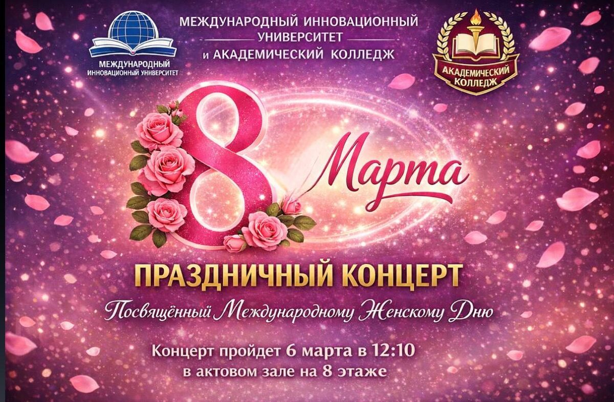 🌺 Весна начинается в МИУ! Приглашаем на праздничный концерт! Дорогие наши дамы — прекрасные студентки, преподаватели и сотрудники университета! В воздухе уже пахнет весной, а это значит, что приближается самый нежный праздник в году. Международный инновационный университет приглашает вас на большой праздничный концерт, посвященный Международному женскому дню! Вас ждут яркие творческие номера, музыкальные поздравления и море весеннего настроения. 📆 Когда: 6 марта ⏰ Во сколько: 12:10 🏛 Где: Актовый зал университета (8 этаж) Приходите за порцией вдохновения и улыбок! Давайте вместе встретим эту весну красиво. #МИУ #8марта #МеждународныйЖенскийДень #ВеснаВМИУ #Праздник #Концерт