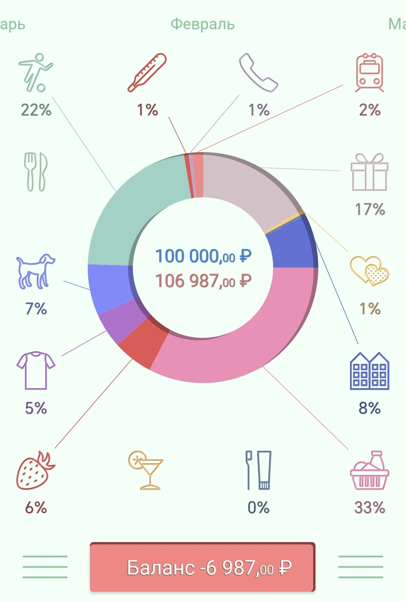 Траты на продукты в районе 35 к - стало традицией. Только в январе это было 20 к. Все остальные месяца (кроме декабря) примерно +-35к.