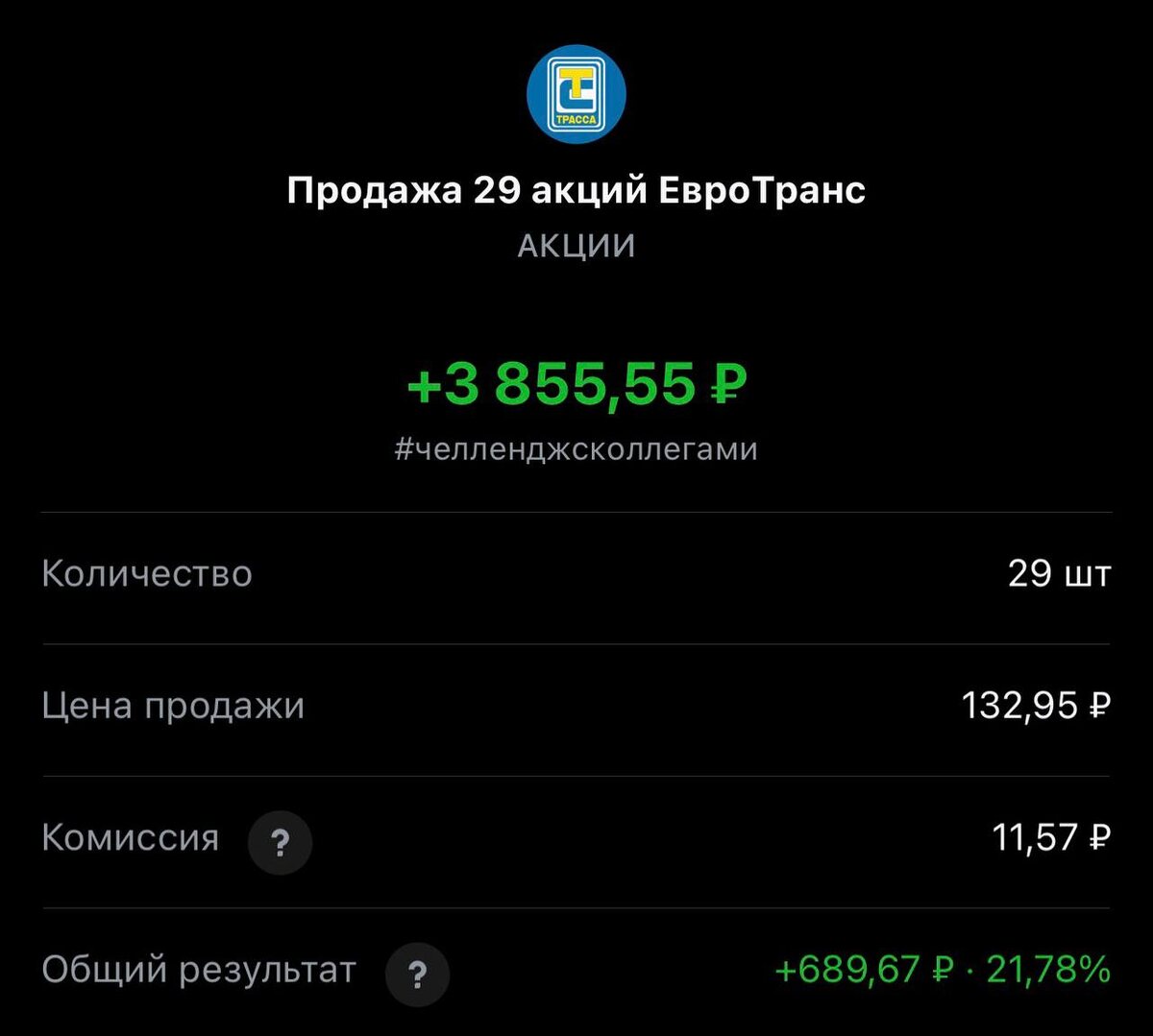 ! Сегодня покупка и продажа #375 Статистика портфеля на стороннем сервисе, можно посмотреть по "ссылке" Напомню это челлендж с коллегами, каждый рабочий день пополняем брокерский счет на 250 рублей и инвестируем. Если возникли вопросы или есть не понимание, что делать. Задавайте «тут» ПРОДАЖА 🔴 «ЕвроТранс» 132.95 rub #EUTR Закрываем весь объем Покупка #375 🟢 «Селигдар» 57.19 rub #SELG Покупка на все свободные деньги #каждыйсможет #челенджсколлегами ✈️ Стас Мироненко