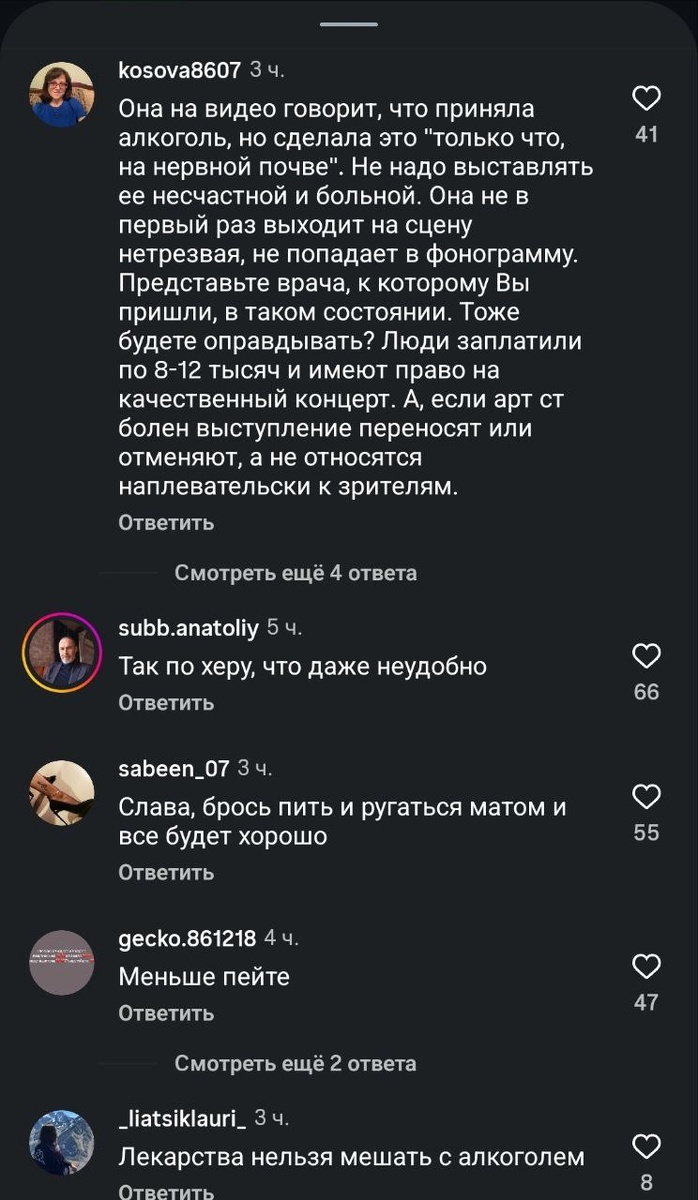 Вопрос к вам, дорогие читатели. Вот вы сидите в зале, купили билет за свои деньги. Артист выходит больной, еле стоит, но честно говорит: «Чувствую себя плохо, кто хочет уйти — верну деньги». Вы уйдете или останетесь? А если останетесь, а какие-то люди начнут лезть на сцену и срывать концерт — на чьей вы будете стороне? Пишите в комментариях. Потому что эта история гораздо сложнее, чем кажется на первый взгляд. И одно можно сказать точно: те, кто приходит на концерт не за музыкой, а за скандалом, поступают неправильно. Тут даже спорить не о чем.