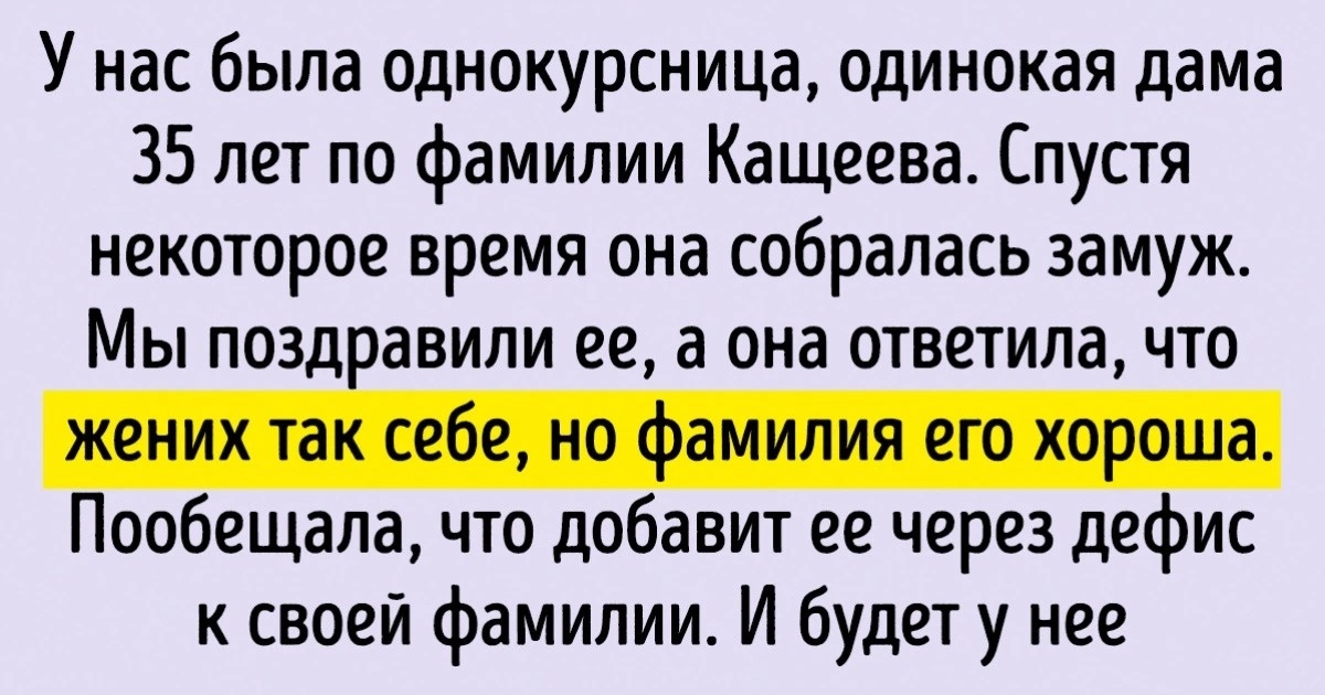 У нас была однокурсница, одинокая дама 35 лет по фамилии Кащеева. Спустя некоторое время она собралась замуж. Мы поздравили ее с удачным выбором, но она ответила, что жених так себе, но фамилия жениха хороша. Пообещала, что добавит ее через дефис к своей фамилии. И будет у нее фамилия тогда Кащеева-Бессмертная. © Дагни
