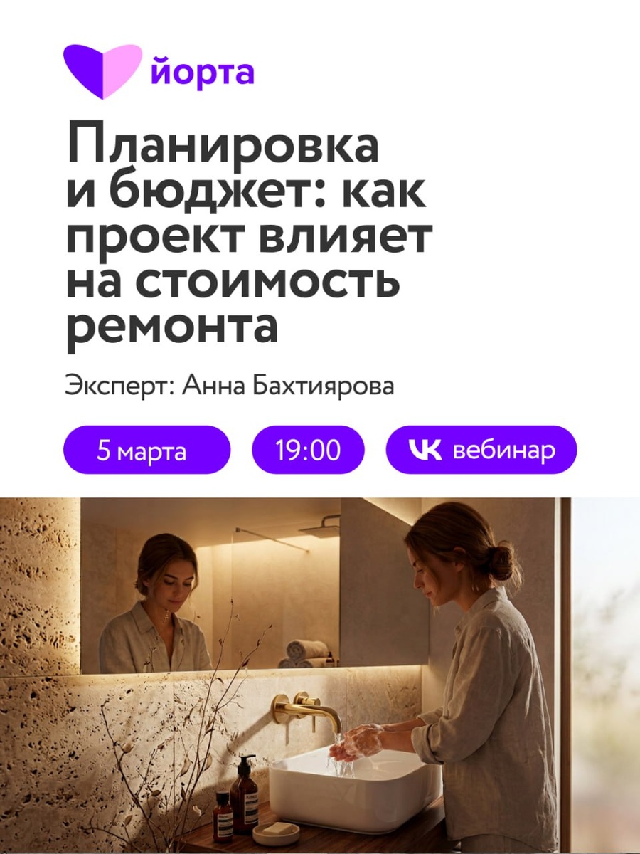 » Почему смета в ванной вдруг растёт? Хотя вроде всё считали и «ничего лишнего» не брали. Чаще всего причина простая: вы просто не просчитали планировку🛠 Лишний короб, перенос труб по месту, неправильная раскладка керамогранита — и ремонт в ванной комнате уже выходит совсем в другие цифры. Мы в Йорте такие истории видим постоянно, и почти всегда можно было избежать лишних трат ещё на старте. Покажем на реальных примерах, какие решения экономят деньги, а какие тихо увеличивают смету. Без сложной теории, по-человечески и по делу. 📆 5 марта ⏰ 19:00 (17:00 по мск) 📱 Группа ВКонтакте Если планируете ремонт, приходите. Лучше один вечер с расчётами, чем потом переделки.