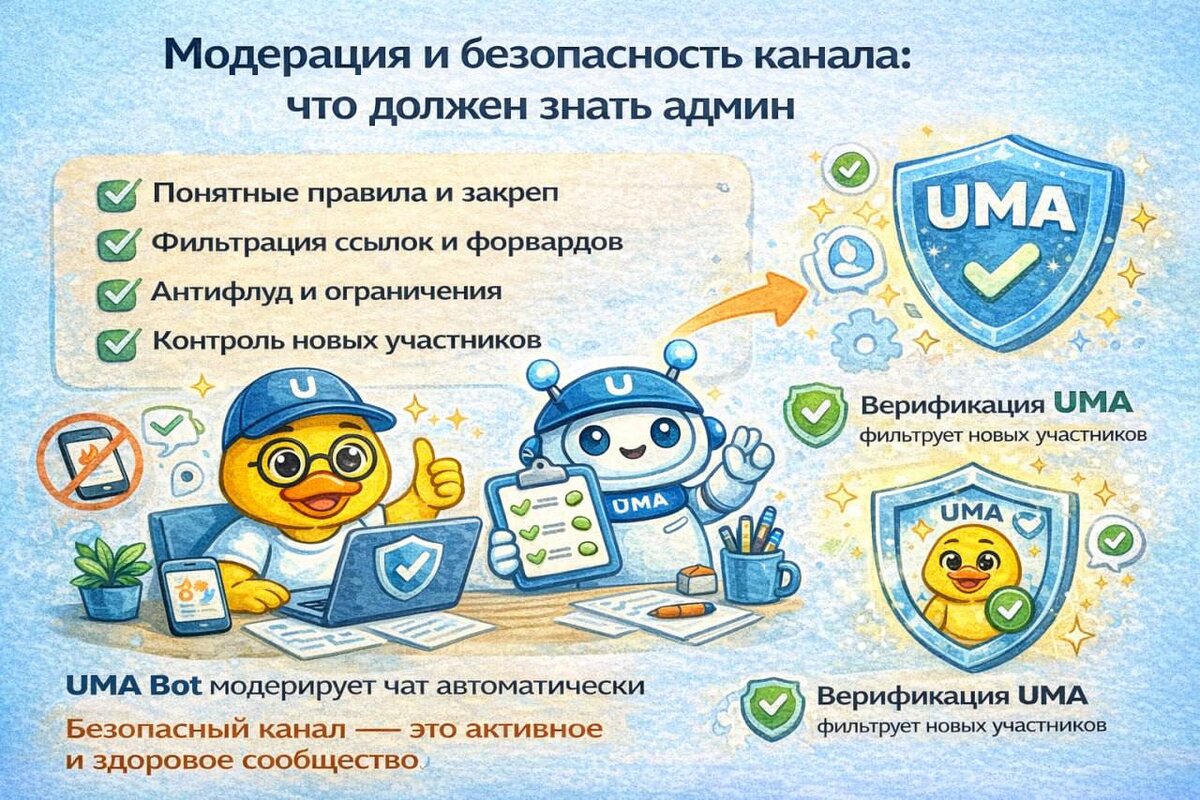Большинство проблем в Telegram начинаются не с хейта, а с отсутствия системы. Пока чат маленький — всё спокойно. Как только начинается рост, появляются спам, флуд, ссылки, конфликты. И админ внезапно превращается в круглосуточную службу поддержки. Базовые вещи, которые должны быть настроены заранее: — понятные правила и закреп; — фильтрация ссылок и форвардов; — антифлуд и ограничения по сообщениям; — контроль новых участников. Модерация — это не про жёсткость, а про атмосферу. Когда в чате порядок, активные участники остаются, обсуждения становятся качественнее, а доверие к каналу растёт. Чтобы не держать всё вручную, нужна автоматизация. UMA Bot (http://t.me/Razvitiekanala_bot) закрывает рутину: удаляет нежелательные сообщения, управляет ограничениями, помогает поддерживать дисциплину без постоянного ручного контроля. Если канал активно растёт, подключение Верификации UMA (http://t.me/VerifUMA_bot) позволяет фильтровать подозрительные аккаунты ещё на входе и снижать нагрузку на админ