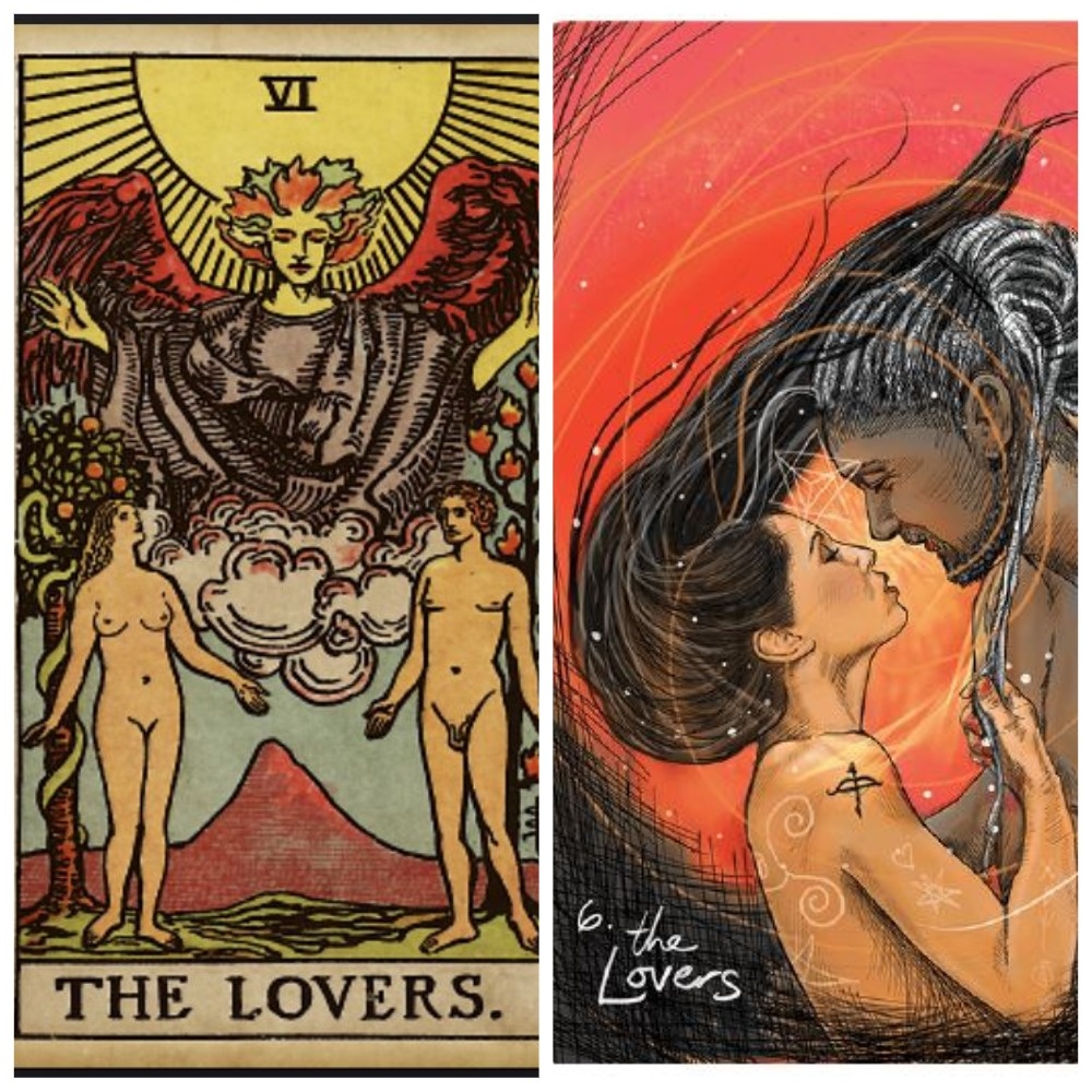 Классическое изображение Влюбленных – мужчина и женщина в райском саду, над ними парящий ангел и ярко светит солнце. За спиной у Адама Древо Жизни, а за спиной у Евы – Древо Познания. Это говорит о главном качестве аркана: человек всегда свободен в выборе, но выбор должен быть осознанным. Выбор должен быть по любви.