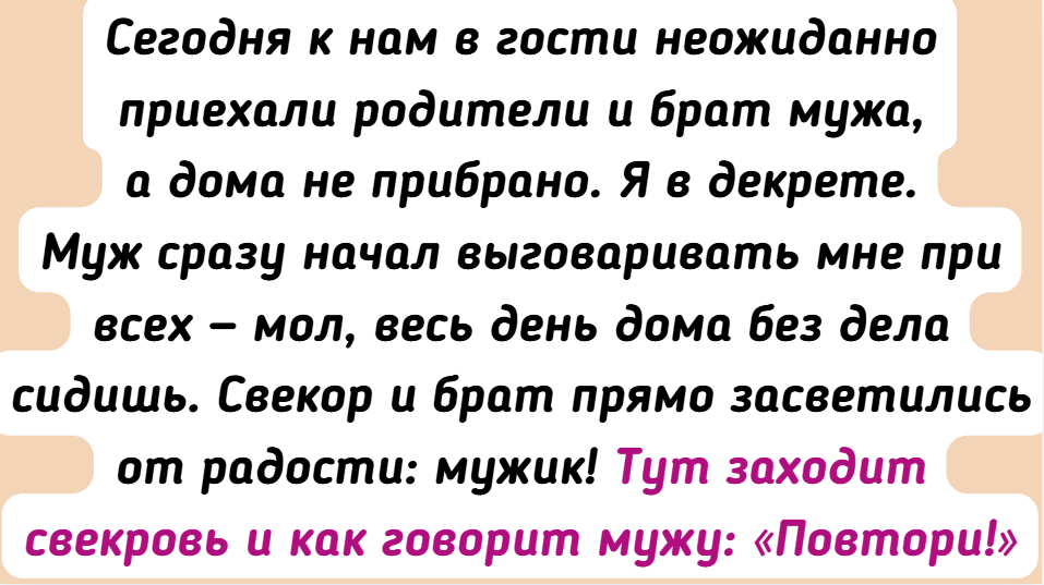 - Сегодня к нам в гости неожиданно приехали родители и брат мужа, а дома не прибрано. Я в декрете. Муж сразу начал выговаривать мне при всех — мол, весь день дома без дела сидишь. Свекор и брат прямо засветились от радости: мужик! Тут заходит свекровь и как говорит мужу: «Повтори!» Муж начал отнекиваться, и в этот момент свекровь прервала его вопросом: «Значит, вы 48 лет считали меня бездельницей?» И тишина — все в ступоре. Свекор, брат мужа и он сам стоят и не знают, что сказать. Потом она собралась и сказала мне: «Прости, я, оказывается, пока бездельничала, забыла воспитать сына!» — и ушла. © rosenomoya