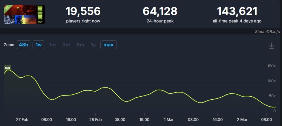 Онлайн бета-теста Marathon, кстати, сейчас составляет почти 20 тыс. В целом эти дни онлайн держался на уровне 60-70 тыс. игроков. Если посмотреть форумы, то многие просто закрыли весь контент, который был доступен. Остаётся глядеть на цифры на релизе 5 марта, когда откроют ещё две карты и разблокируют апгрейды у фракций. #игры@inyoueyes