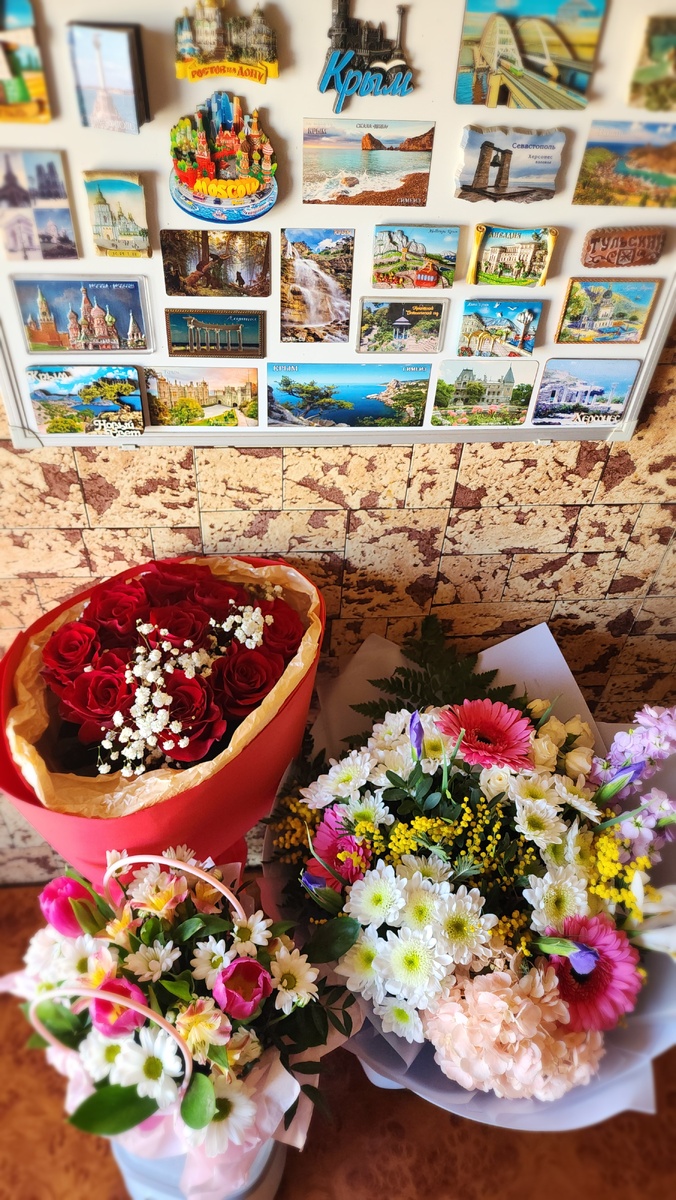 Изумительные букеты цветов создали в квартире праздничную атмосферу. Свежие, ароматные, как сама весна. Я с удовольствием прикасалась к прекрасному: нежным лепесткам, приятной на ощупь бумаге. Оазис весенних красок, ароматов и настроения. Розы, хризантемы, тюльпаны, ромашки, мимозы, гортензии, герберы, альстромерии, маттиолы и ещё нераскрывшиеся ирисы - каждый цветок по-своему неповторим.