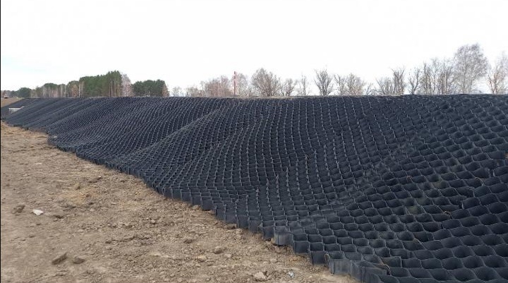 Знаете, что делает дорогу долговечной? Правильное укрепление откосов! ⛰️ На 53-м километре трассы Тюмень — Омск сейчас ведутся работы с применением объемной георешетки BENTOLOCK от тюменского производителя «СибСтройЭкология». 🟢 Высота ячейки: 100 мм