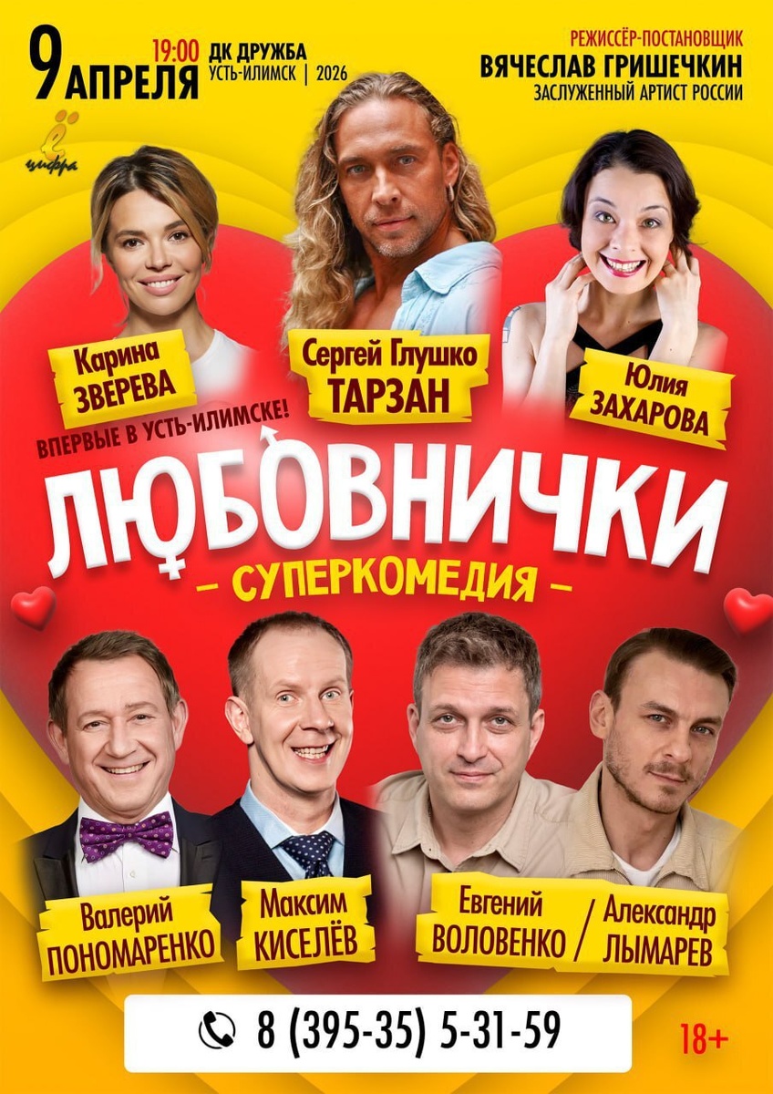 ! 📌 9 апреля 🕖 19.00 Убойная комедия интересных положений «Любовнички»! Спектакль уже посмотрели 90 000 зрителей более чем в 100 городах! В ролях: Максим Киселев («Однажды в России») Сергей «Тарзан» Глушко («Ночная смена») Валерий Пономаренко Александр Лымарев («Солдаты») Евгений Воловенко («По законам военного времени») Карина Зверева («Полярный») Юлия Захарова («Счастливы вместе») В этой невероятно смешной истории происходит столько неожиданных ситуаций, которые будут вызывать у зрителей продолжительный хохот, что это просто невозможно пересказать… Это надо увидеть своими глазами! Спектакль наполнен невероятным количеством юмора! Зрители, посмотрев один раз нашу комедию, захотят снова и снова увидеть её, чтобы вновь получить невероятное удовольствие и мощную вакцину смехотерапии. Билеты в кассе ГДК «Дружба», тел. 8(39535)5-31-59 и онлайн: https://clck.ru/3RMry3📌