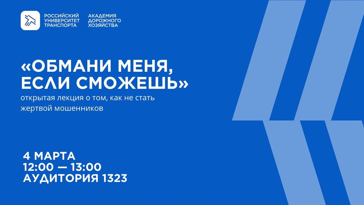 Академия дорожного хозяйства РУТ организовывает встречу с экспертами по кибербезопасности и правовой защите для РУТ. 4 марта 12:00 – 14:30 Аудитория 1323 Сегодня мошенники больше не скрываются где-то на задворках интернета — они здесь, рядом: в Telegram-ботах, студенческих чатах, объявлениях о подработке и аренде жилья. Эксперты разберут: ⭕кто такие дропы и почему «просто помочь перевести деньги» может закончиться уголовной ответственностью ⭕ как работают фишинговые Telegram-боты и фейковые заказы с доставкой ⭕ почему «лёгкая подработка» и опросы для студентов это частая схема развода ⭕ как отличить настоящий сайт от поддельного ⭕ как защитить телефон, аккаунты и банковские данные ⭕ что делать, если вы уже столкнулись с мошенничеством: куда обращаться и как действовать С вами будут работать практики: 🔵 Оксана Евгеньевна Цыбульская — Начальник отдела идентификации ЮЛ ГК «Московская биржа», эксперт по финансовой грамотности 🔵 Юлия Павловна Мушовец — исполнительный
