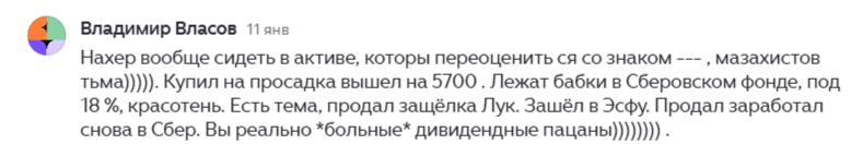 Недавно я приводил пример с Евротрансом, как попытка продать акции, будучи уверенным, что удастся купить дешевле, привела бы к убыткам вместо прибыли (в конце оставлю ссылку). И вот еще один аналогичный пример, но уже с более ТОПовым и более значимым эмитентом - Лукойлом. Значимым не только для рынка в целом, но и, например, конкретно для моего портфеля. Когда в начале января я написал о том, что после дивидендной отсечки акции Лукойла, вероятнее всего, должны падать, а также что их справедливую цену вижу как 4000 рублей, получил огромное количество комментариев в духе "так надо продавать, чтобы потом купить дешевле". Многие при этом написали, что сами так поступили - продали акции еще даже без дивидендов, и начнут откупать только дешевле 5000 рублей, а то и по 4000. Вот примеры таких комментариев, можно обратить внимание, что они имеют огромную поддержку, судя по лайкам. Пришли и откровенные хейтеры, воспользовавшись случаем. Я всем отвечал, что не могу быть уверенным в том, что цена