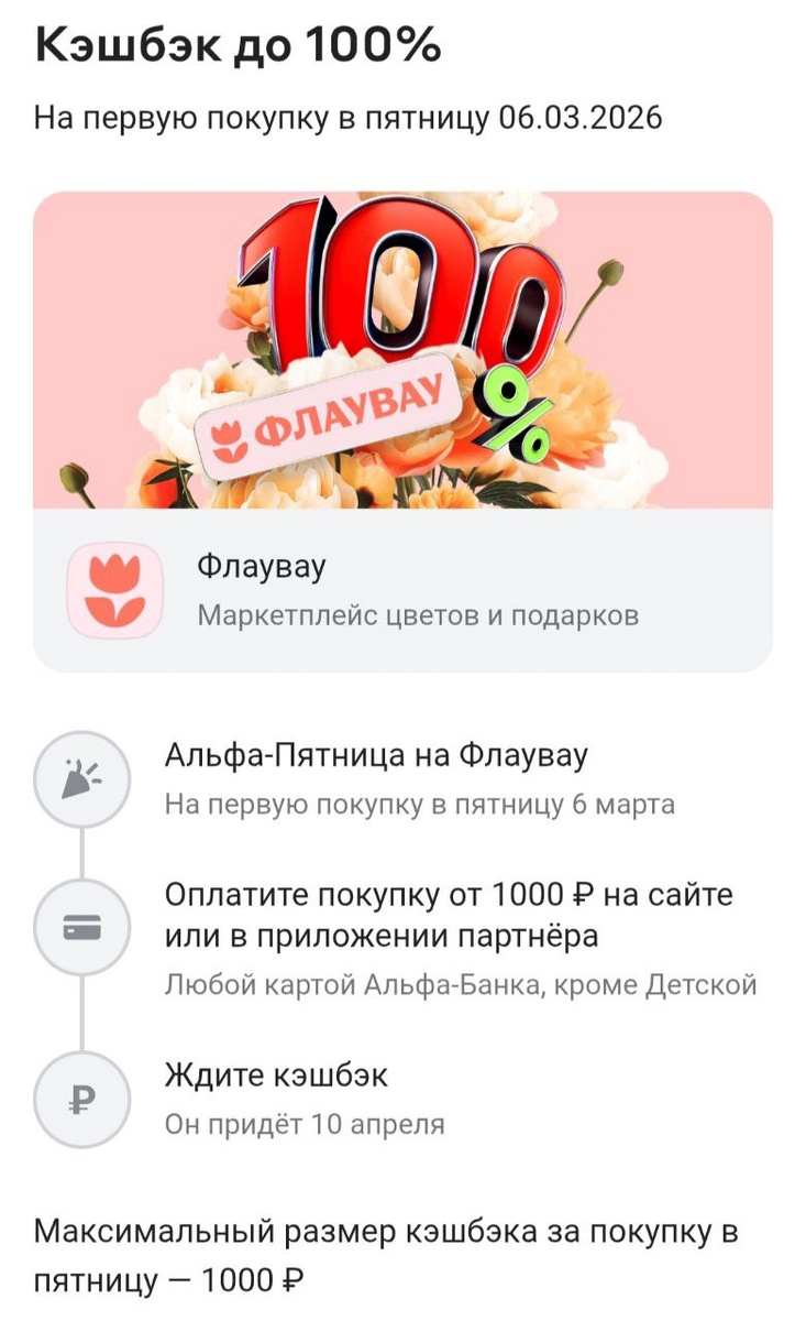 Всем привет! С вами Любовь - эксперт по акциям, скидкам и халяве с 20-летним стажем. Сегодня расскажу, как не упустить шанс получить 100% кешбэк на покупки в ФлауВау с картой Альфа-Банка - и почему на этот раз всё должно пройти без сюрпризов. Личный опыт: В прошлый раз многие и я в том числе заказывали сертификаты, но продавец отменил все заказы. На этот раз в правилах чётко прописано: кешбэк не действует на сертификаты - так что выбирайте реальные товары (цветы, десерты, подарки к 8 Марта). Пример: Оформляете карту → получаете сертификат → покупаете подарок на 8 Марта за счёт банка → участвуете в акции альфапятница с ФлауВау и возвращаете до 1000 ₽ за букет.. Двойная выгода! Альфа-Банку и ФлауВау даем второй шанс? Заказывайте реальные товары, получайте кешбэк и радуйте близких подарками к 8 Марта. А вы уже участвовали в этой акции? Делитесь в комментариях, что заказали и получилось ли вернуть деньги! P.S. Если ещё не подписаны на мой блог - подписывайтесь, тут на дзене, больше выгодн