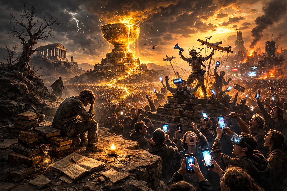 Автор этих строк никогда не возлагал на нашу цивилизацию надежд на обязательный благополучный финал. Эта маленькая статья не несёт в себе цели чудесного исцеления общества и возвращения его к здравому смыслу, которым оно, по правде говоря, никогда в полной мере и не руководствовалось. Поэтому задача этого текста иная. Она не политическая, а экзистенциальная. Это попытка подать сигнал бедствия или, если угодно, зажечь маяк над бушующим морем глупости. Я пишу это с единственной целью: ободрить тех немногих, кто ещё сохранил ясность взгляда. Чтобы вы, читая эти строки, знали наверняка: вы не сошли с ума. Вы не одни. Я тоже это вижу.