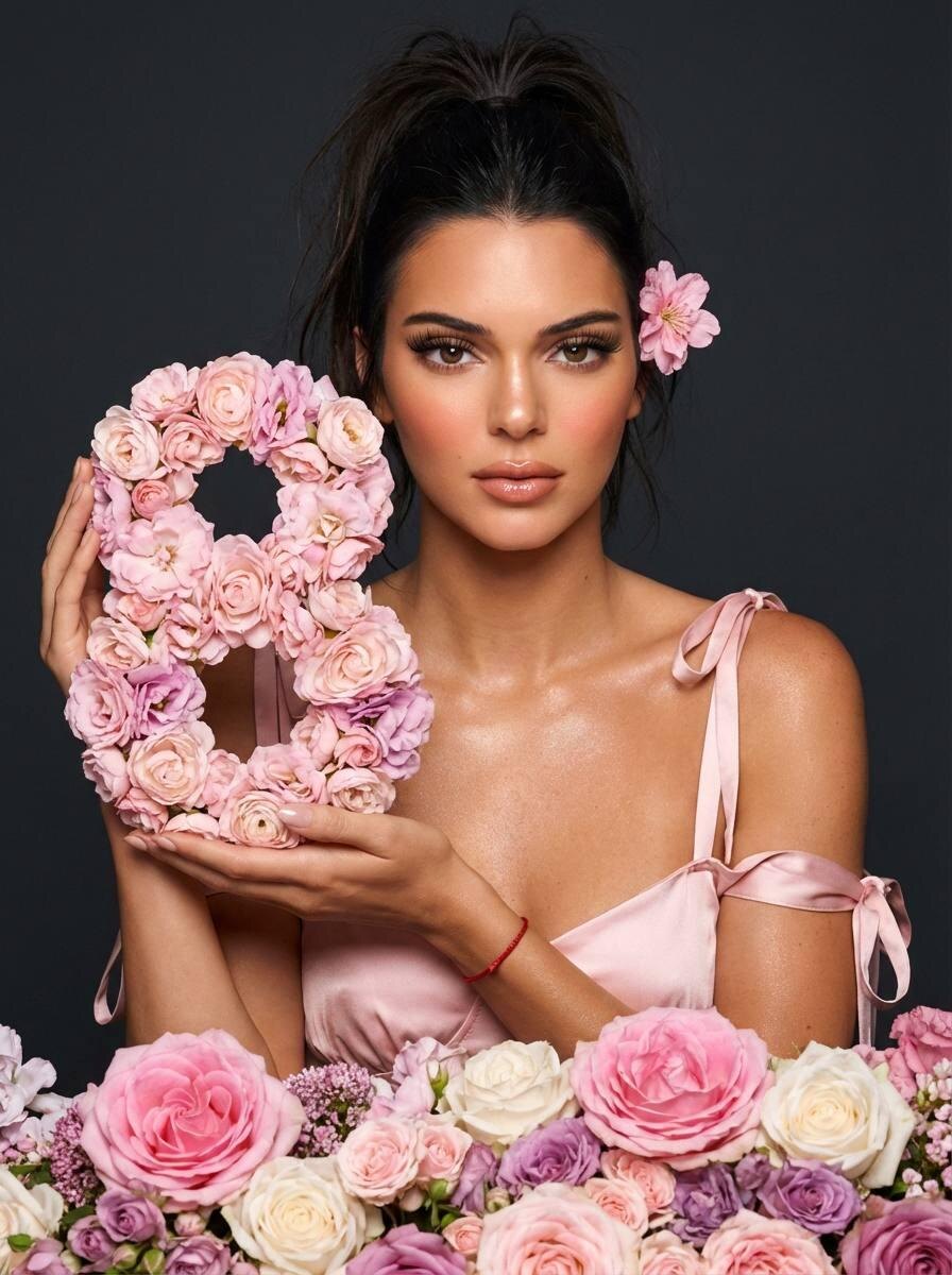 Сгенерировать фото⚡️ Подробный портрет девушки строго сохрани пропорции, цвет волос, внешность.Ее взгляд направлен прямо на зрителя, выражая мягкость и притягательность. На правой стороне ее головы расположен небольшой нежно-розовый цветок, служащий акцентным украшением. Девушка держит в руках перед собой большую светло-розовую цифру «8», изящно и полностью состоящую из разных бутонов цветов,она аккуратно поддерживая ее обеими руками.На ее левом запястье видна красная нить. Она погружена в пышное море разнообразных цветов: доминируют крупные, раскрывшиеся ярко-розовые и пастельно-розовые розы, а также присутствуют мелкие белые и пурпурные цветы, формируя богатый и многослойный цветочный передний план и средний план. Фон однотонный, глубокий темно-серый, создающий эффектный контраст и подчеркивающий яркость и нежность композиции. Освещение мягкое, равномерное студийное, подчеркивающее объем и текстуру, с легким свечением, делающим черты лица и лепестки цветов выразительными. Компози