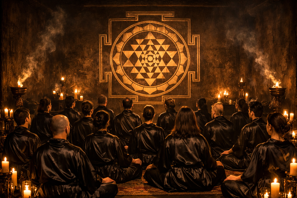 Достигнув широкого проёма в конце коридора, скрытого за завесой плотной, тяжёлой портьеры, процессия по одному, неторопливо начала входить. Когда подошла его очередь, Антон раздвинул руками бархат ткани и шагнул внутрь. В просторном полумраке зала его взору предстало множество людей, облачённых в чёрный атлас, сидящих в позе лотоса на полу, лицами обращённых к огромной мандале, нарисованной на стене. По углам комнаты мерцали свечи в высоких подсвечниках, и спиралями вился дым благовоний.