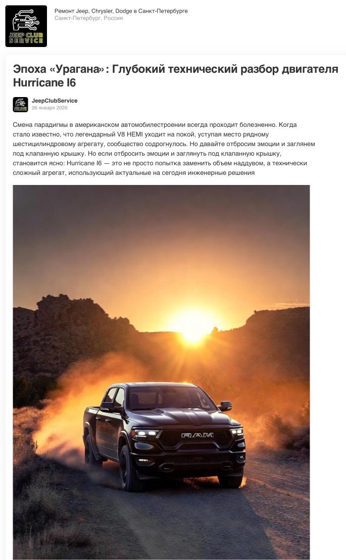 Смена парадигмы в американском автомобилестроении всегда проходит болезненно. Когда стало известно, что легендарный V8 HEMI уходит на покой, уступая место рядному шестицилиндровому агрегату, сообщество содрогнулось. Но давайте отбросим эмоции и заглянем под клапанную крышку. Но если отбросить эмоции и заглянуть под клапанную крышку, становится ясно: Hurricane I6 — это не просто попытка заменить объем наддувом, а технически сложный агрегат, использующий актуальные на сегодня инженерные решения Читайте далее нашу статью по ссылкам ниже: Drive • Дзен