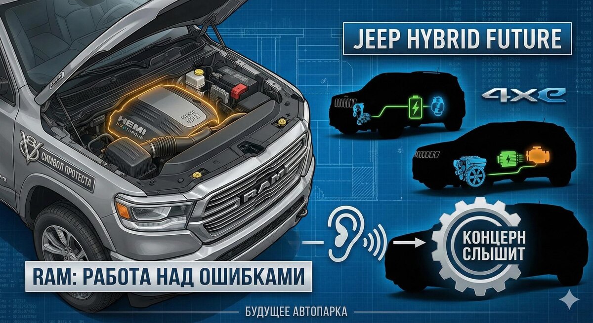 Мы видим, что производитель наконец-то начал прислушиваться к реальным запросам владельцев, корректируя стратегию в пользу проверенных решений. RAM: работа над ошибками Главная новость — в линейку 2026 года официально возвращается легендарный 5.7 HEMI V8. Мы заметили, что многие владельцы скептически приняли полный переход на турбо-шестерки Hurricane, и завод это услышал. Агрегат возвращается не в «чистом» виде, а с системой мягкого гибрида eTorque. Технически это решение нам хорошо знакомо: 48-вольтовый стартер-генератор заменяет привычный генератор, обеспечивая плавный старт-стоп и добавляя крутящий момент в начале движения. Интересная деталь: на крыльях этих версий появится уникальный шильдик, который инженеры внутри компании назвали «Символом протеста» — своеобразное извинение перед фанатами марки. 🐏 Jeep: расширение модельного ряда К 2027 году ожидаем три новинки. Готовится смена поколений для Renegade и Compass, также вызывает интерес анонсированный «новый ключевой кроссове