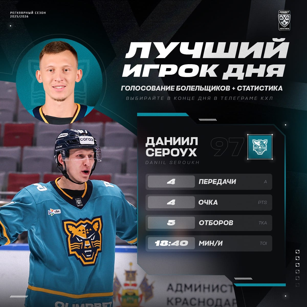 🐆 Даниил Сероух набрал 4 очка и провел вторую по результативности игру в карьере (первая — когда он забил 5 голов)!