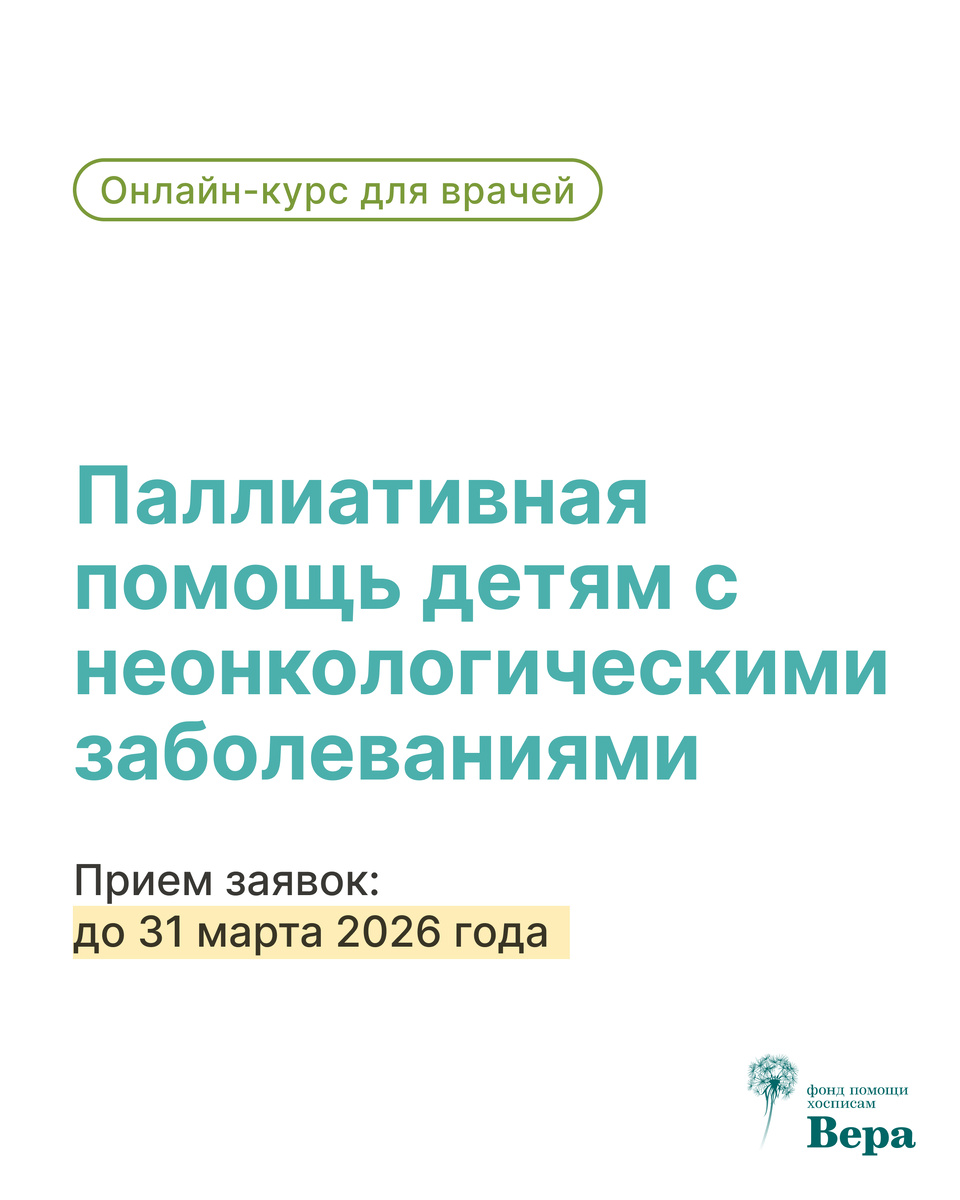 💻 Фонд «Вера» приглашает врачей-педиатров и врачей паллиативной помощи на бесплатный онлайн-курс «Паллиативная помощь детям с неонкологическими заболеваниями» Что вас ждет на курсе ✅ 6 недель обучения в удобном онлайн-формате (сентябрь–октябрь 2026). ✅ Короткие видеоуроки по 10–15 минут — можно смотреть между приёмами или после смены. Достаточно уделять обучению 20-30 мин в день. ✅ Клинические задачи, чек-листы и проверочные задания — чтобы проверить себя. ✅ Онлайн-сессии «вопрос–ответ» с экспертами. 🫂Лекторы курса – признанные российские эксперты по паллиативной помощи, а также неврологи, диетологи, эрготерапевты. Кому курс будет полезен? 🔵Врачам выездных служб паллиативной помощи. 🔵Врачам паллиативных отделений и хосписов. 🔵Врачам ДДИ (особенно в отделениях милосердия). 🔵Врачам первичного звена, которые сталкиваются с паллиативными пациентами. Как попасть? ✅ Курс бесплатный. ❤️🩹 Мы приглашаем всех врачей, кому эти знания действительно нужны и важны. ⏩Для участия заполните ан